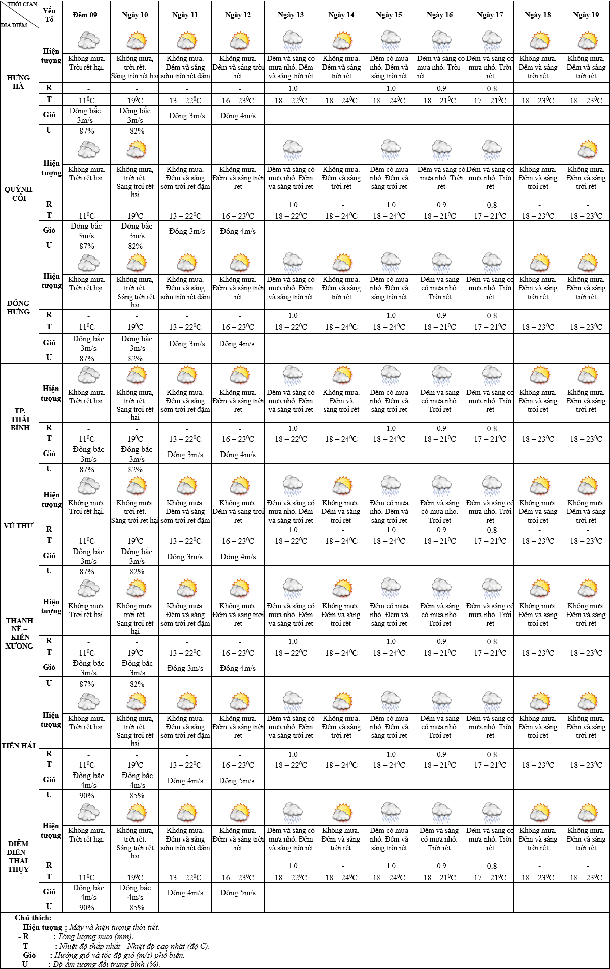 DỰ BÁO THỜI TIẾT ĐIỂM 10 NGÀY KHU VỰC THÁI BÌNH TỪ ĐÊM 09 – 19/02/2025