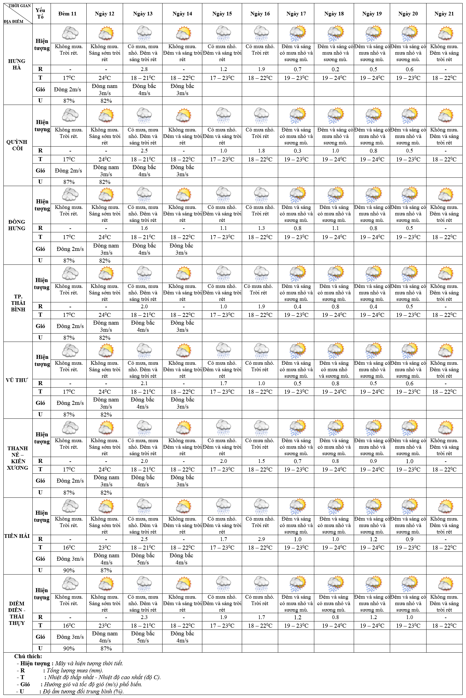 DỰ BÁO THỜI TIẾT ĐIỂM 10 NGÀY KHU VỰC THÁI BÌNH TỪ ĐÊM 11 – 21/02/2025