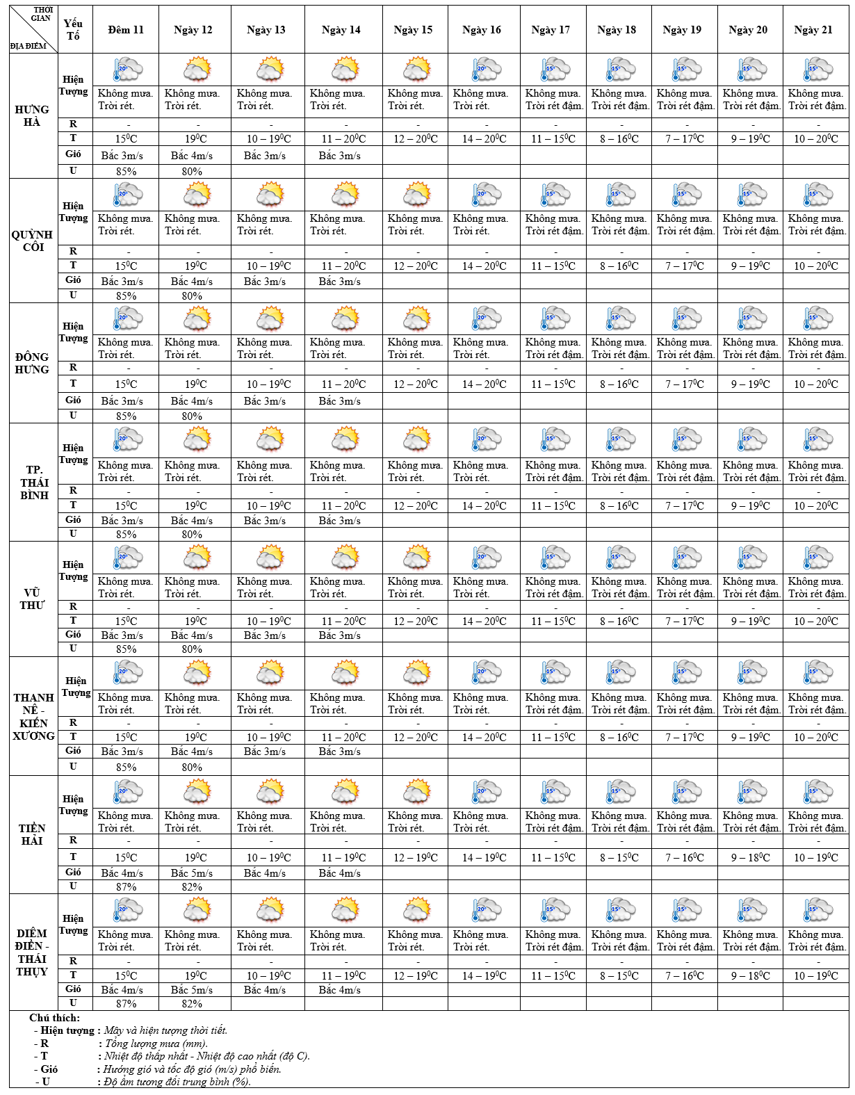 DỰ BÁO THỜI TIẾT ĐIỂM 10 NGÀY KHU VỰC THÁI BÌNH TỪ ĐÊM 11 – 21/12/2022
