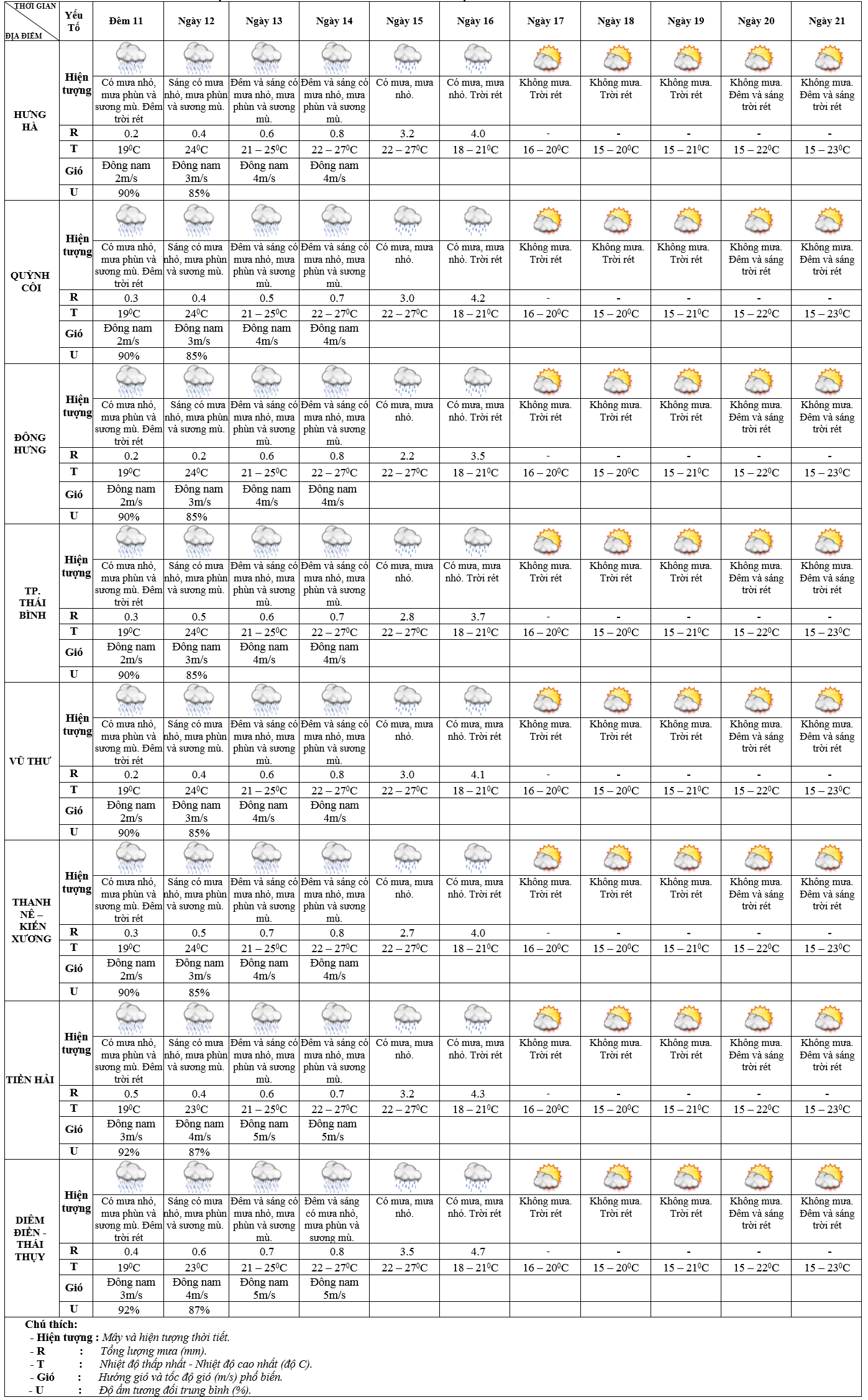DỰ BÁO THỜI TIẾT ĐIỂM 10 NGÀY KHU VỰC THÁI BÌNH TỪ ĐÊM 11 – 21/3/2025