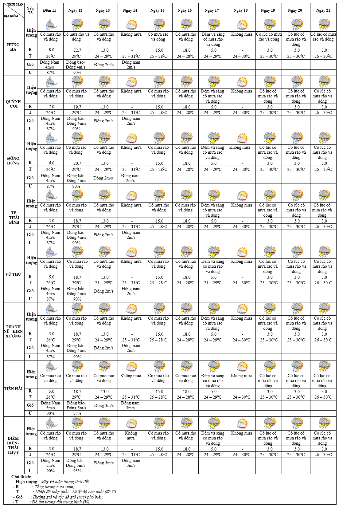 DỰ BÁO THỜI TIẾT ĐIỂM 10 NGÀY KHU VỰC THÁI BÌNH TỪ ĐÊM 11 – 21/5/2024