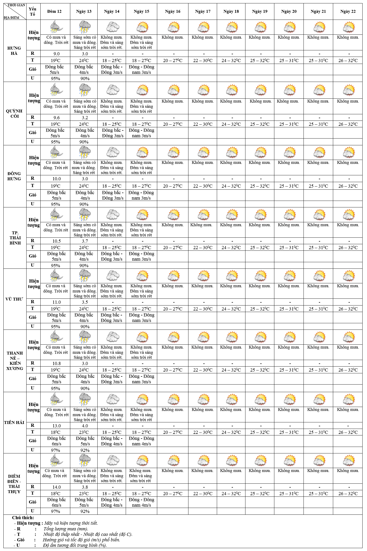 DỰ BÁO THỜI TIẾT ĐIỂM 10 NGÀY KHU VỰC THÁI BÌNH TỪ ĐÊM 12 – 22/4/2025