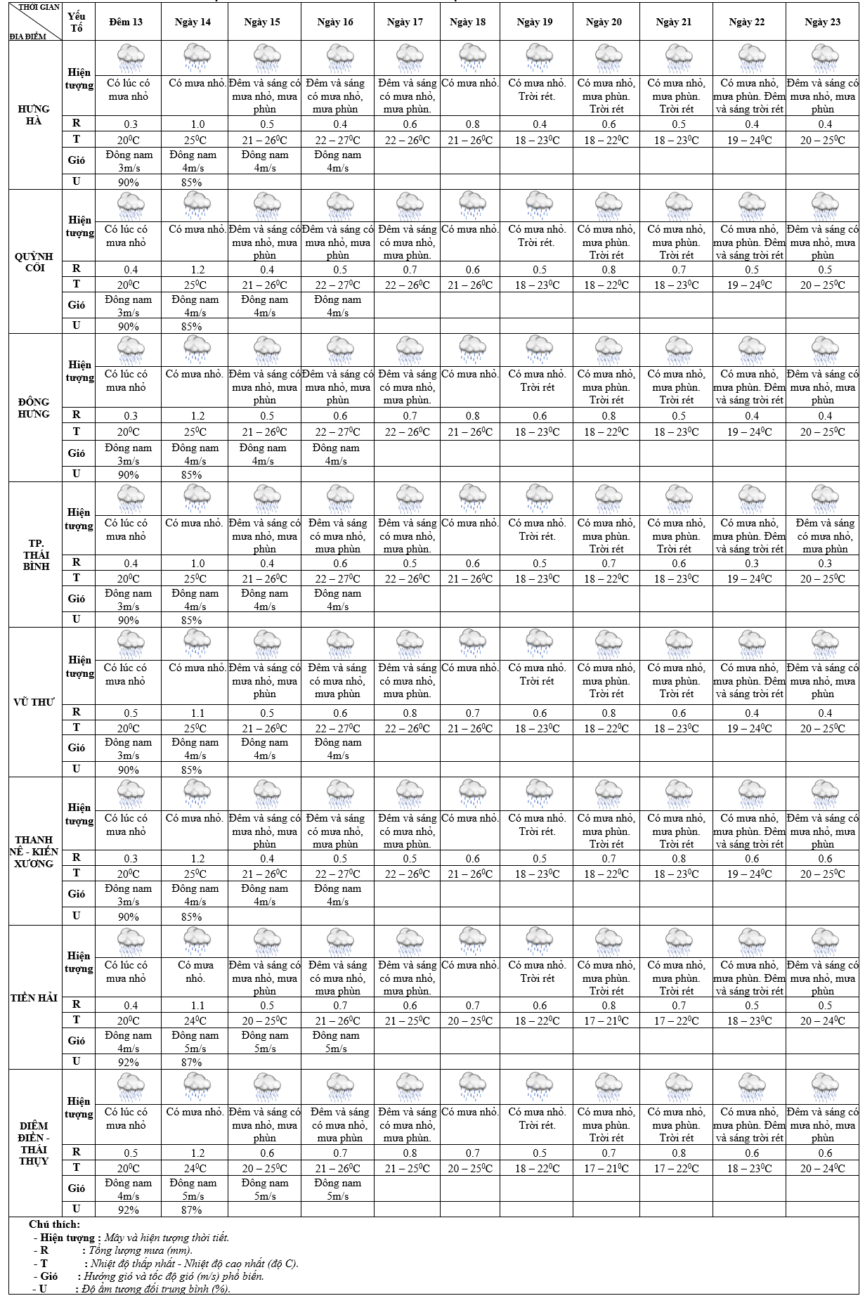 DỰ BÁO THỜI TIẾT ĐIỂM 10 NGÀY KHU VỰC THÁI BÌNH TỪ ĐÊM 13 – 23/03/2024