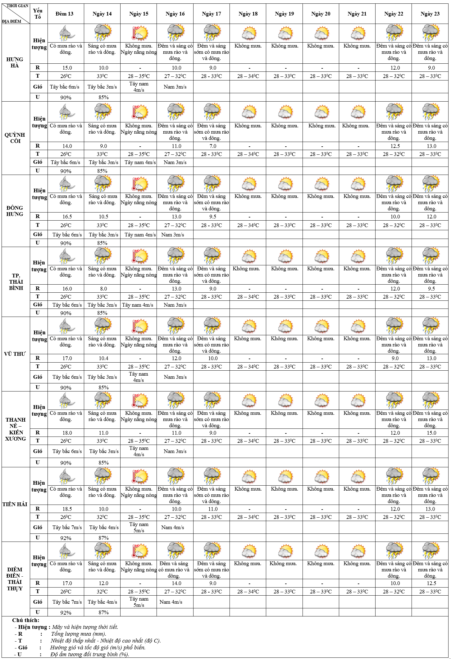 DỰ BÁO THỜI TIẾT ĐIỂM 10 NGÀY KHU VỰC THÁI BÌNH TỪ ĐÊM 13 – 23/6/2025