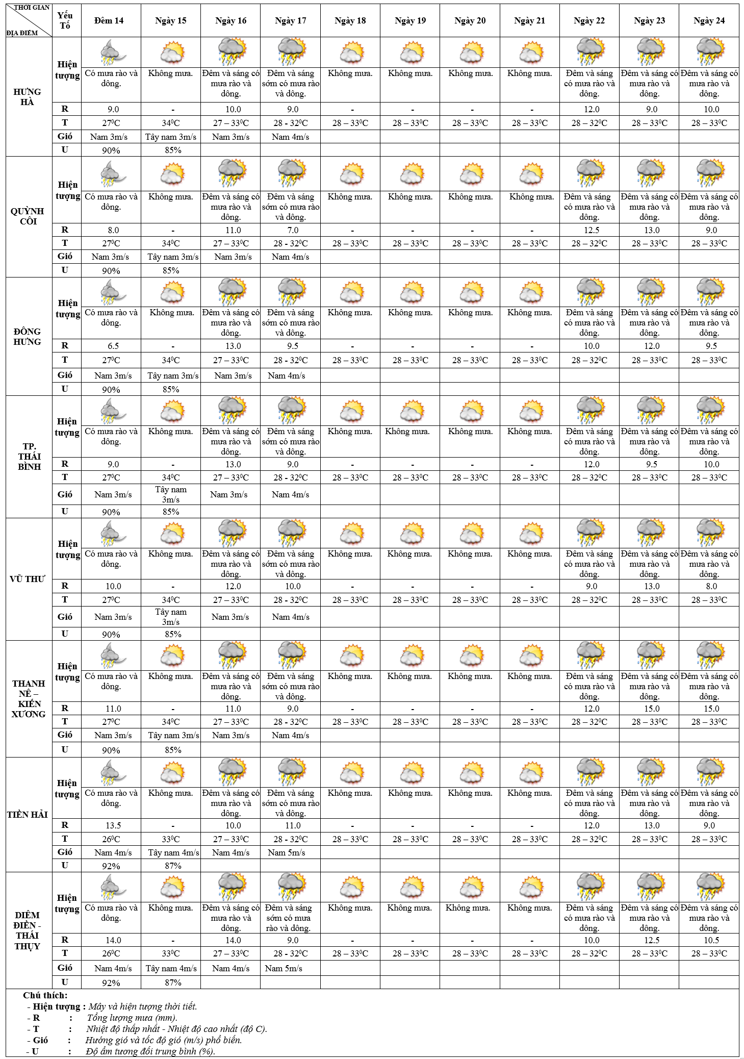 DỰ BÁO THỜI TIẾT ĐIỂM 10 NGÀY KHU VỰC THÁI BÌNH TỪ ĐÊM 14 – 24/6/2025
