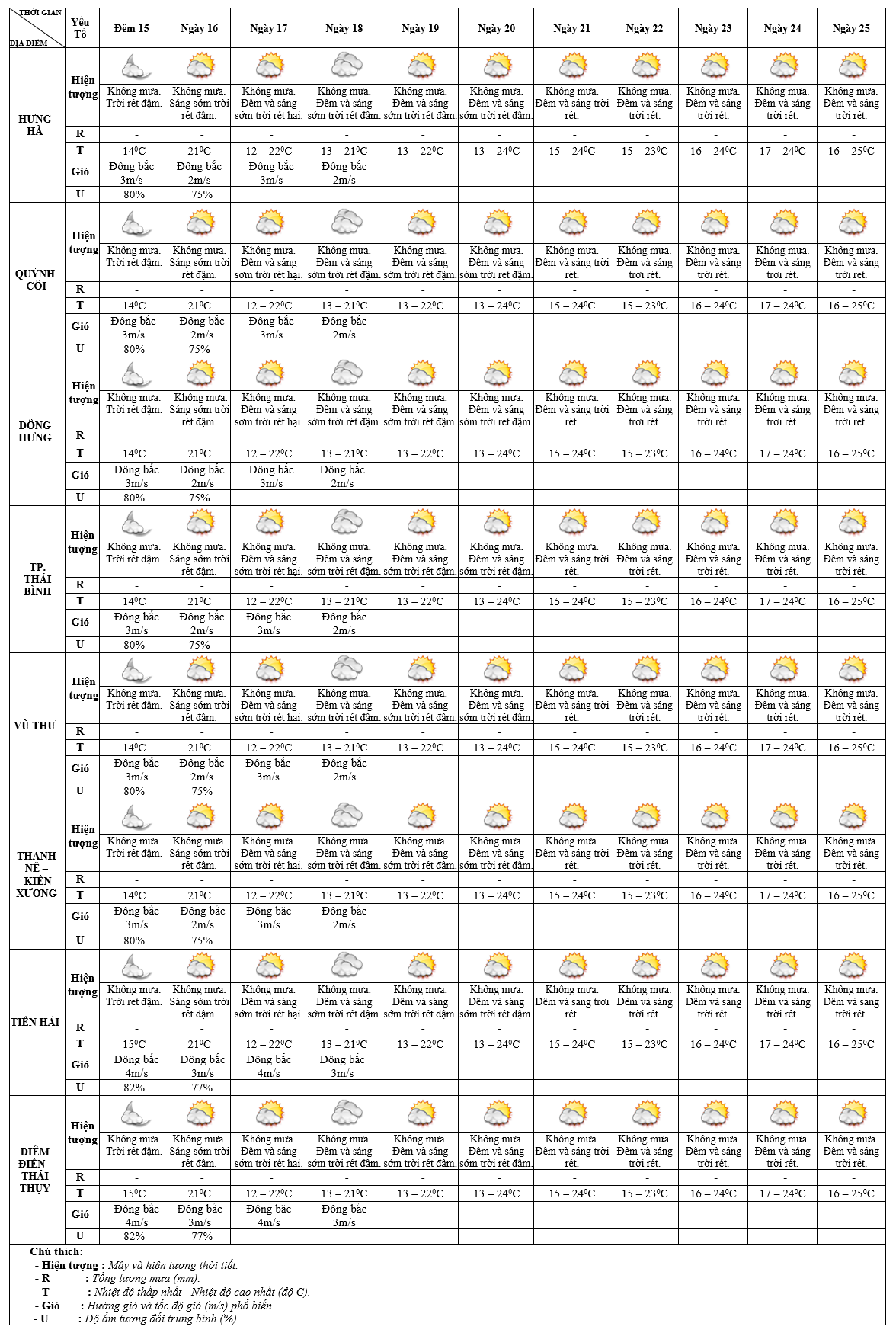 DỰ BÁO THỜI TIẾT ĐIỂM 10 NGÀY KHU VỰC THÁI BÌNH TỪ ĐÊM 15 – 25/01/2025