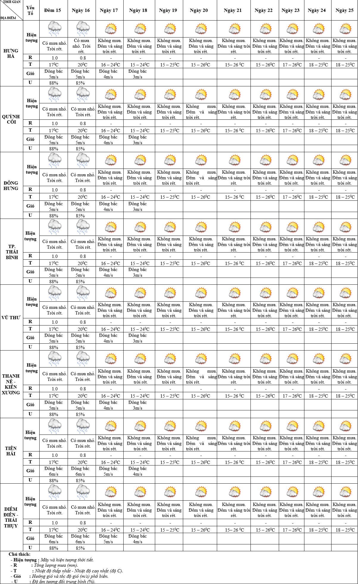 DỰ BÁO THỜI TIẾT ĐIỂM 10 NGÀY KHU VỰC THÁI BÌNH TỪ ĐÊM 15 – 25/11/2023