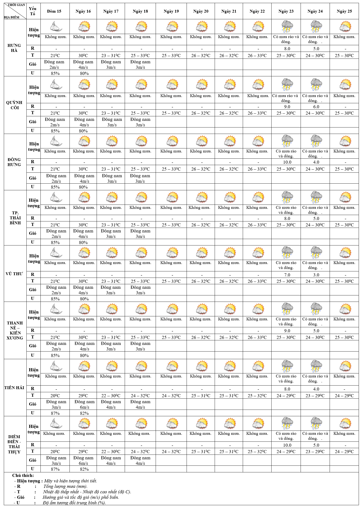 DỰ BÁO THỜI TIẾT ĐIỂM 10 NGÀY KHU VỰC THÁI BÌNH TỪ ĐÊM 15 – 25/4/2025