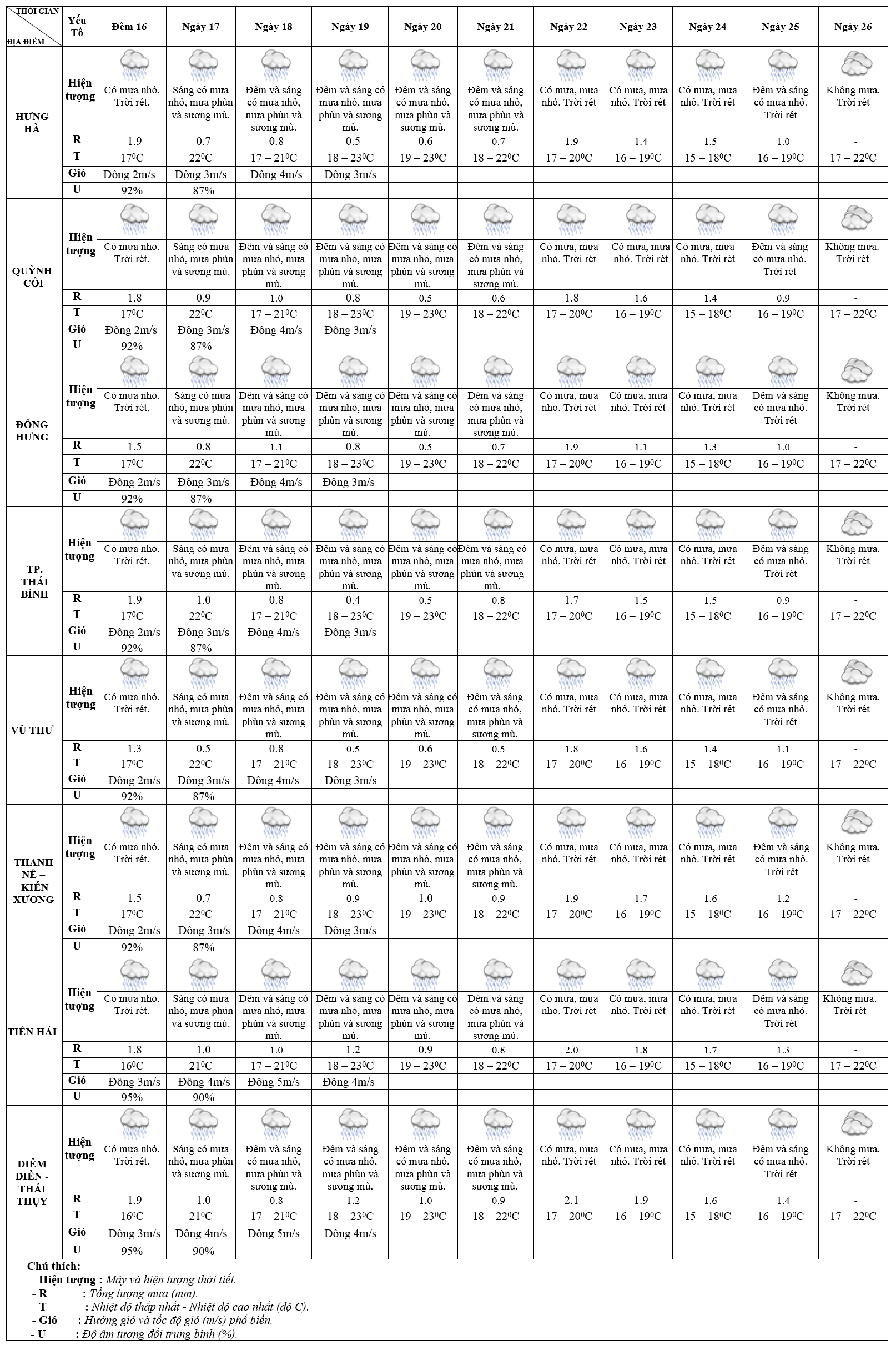 DỰ BÁO THỜI TIẾT ĐIỂM 10 NGÀY KHU VỰC THÁI BÌNH TỪ ĐÊM 16 – 26/02/2025
