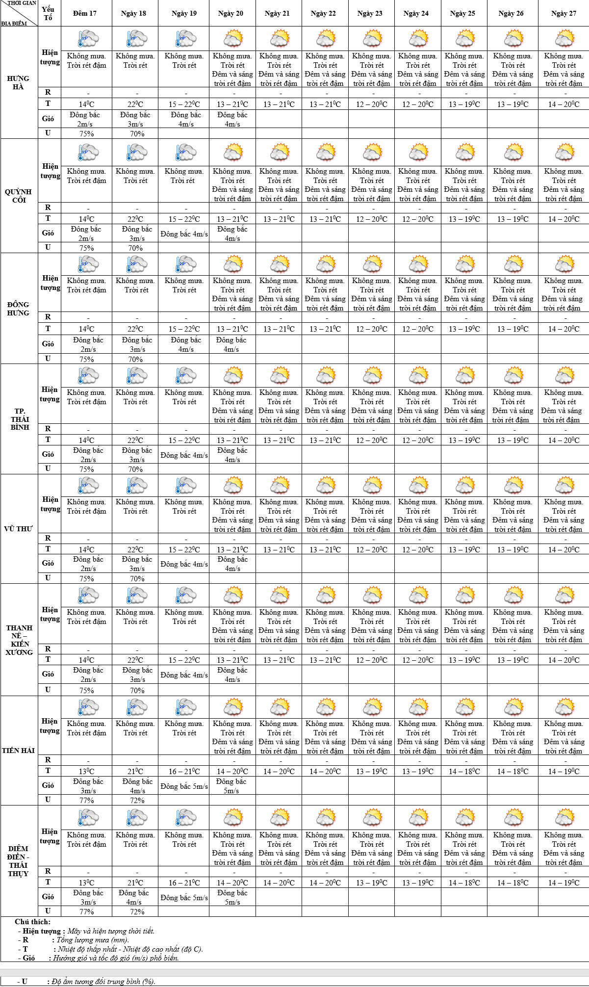 DỰ BÁO THỜI TIẾT ĐIỂM 10 NGÀY KHU VỰC THÁI BÌNH TỪ ĐÊM 17 – 27/12/2024