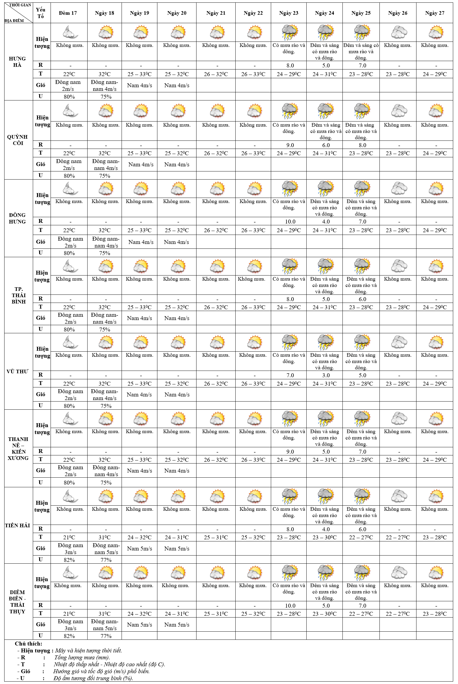 DỰ BÁO THỜI TIẾT ĐIỂM 10 NGÀY KHU VỰC THÁI BÌNH TỪ ĐÊM 17 – 27/4/2025