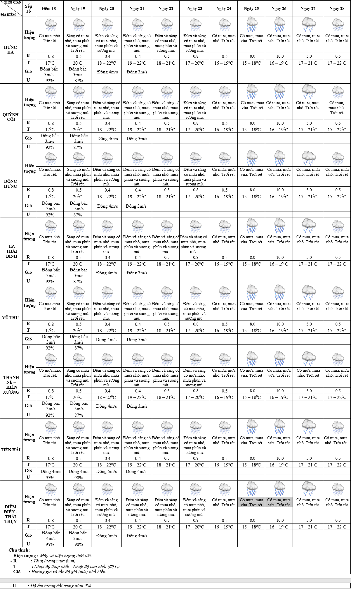 DỰ BÁO THỜI TIẾT ĐIỂM 10 NGÀY KHU VỰC THÁI BÌNH TỪ ĐÊM 18 – 28/02/2025
