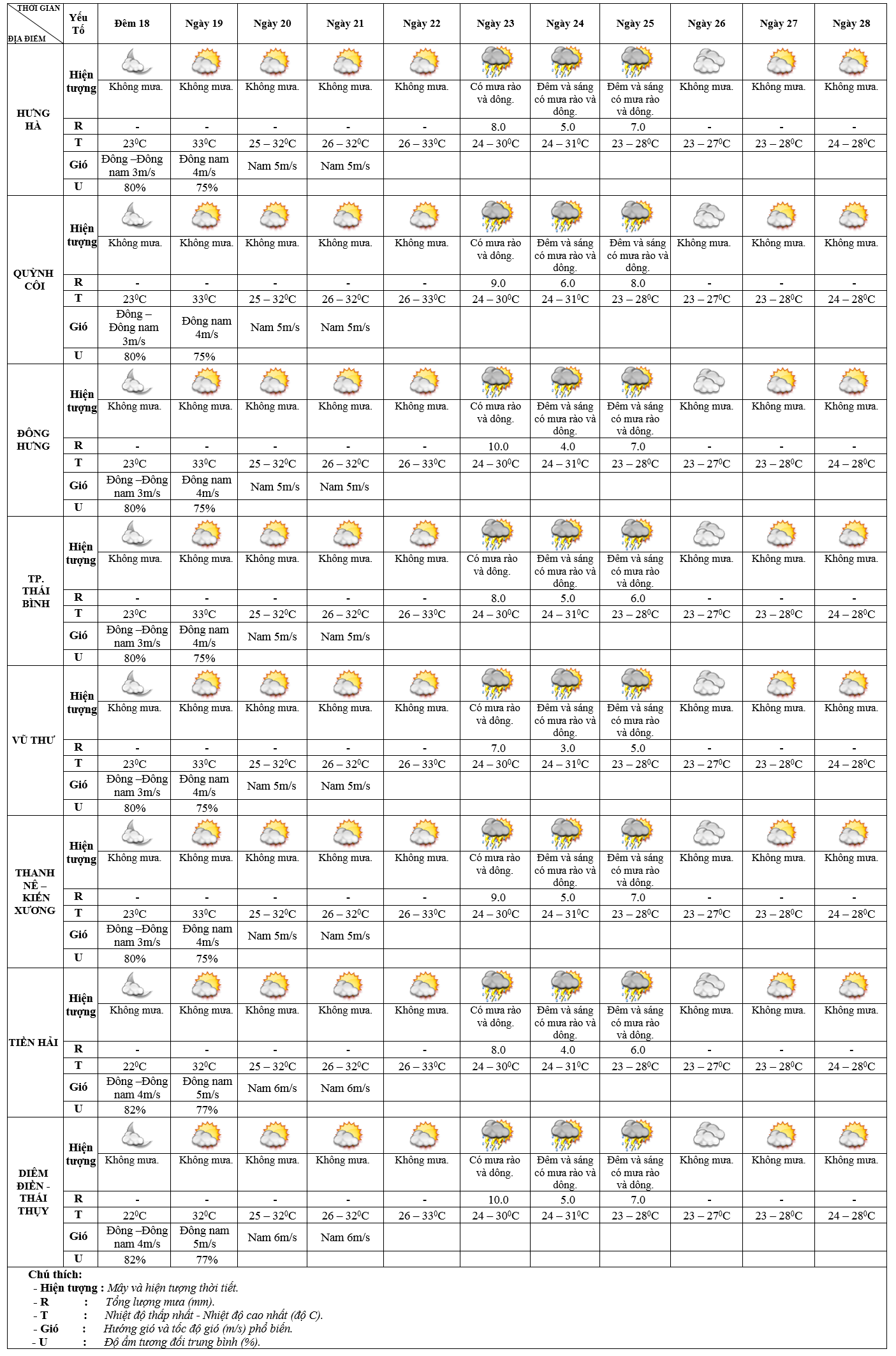 DỰ BÁO THỜI TIẾT ĐIỂM 10 NGÀY KHU VỰC THÁI BÌNH TỪ ĐÊM 18 – 28/4/2025