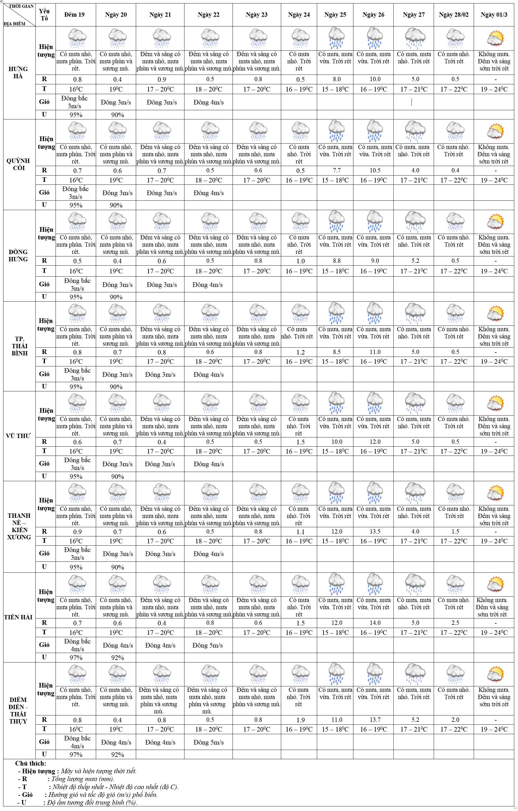 DỰ BÁO THỜI TIẾT ĐIỂM 10 NGÀY KHU VỰC THÁI BÌNH TỪ ĐÊM 19/02 – 01/3/2025