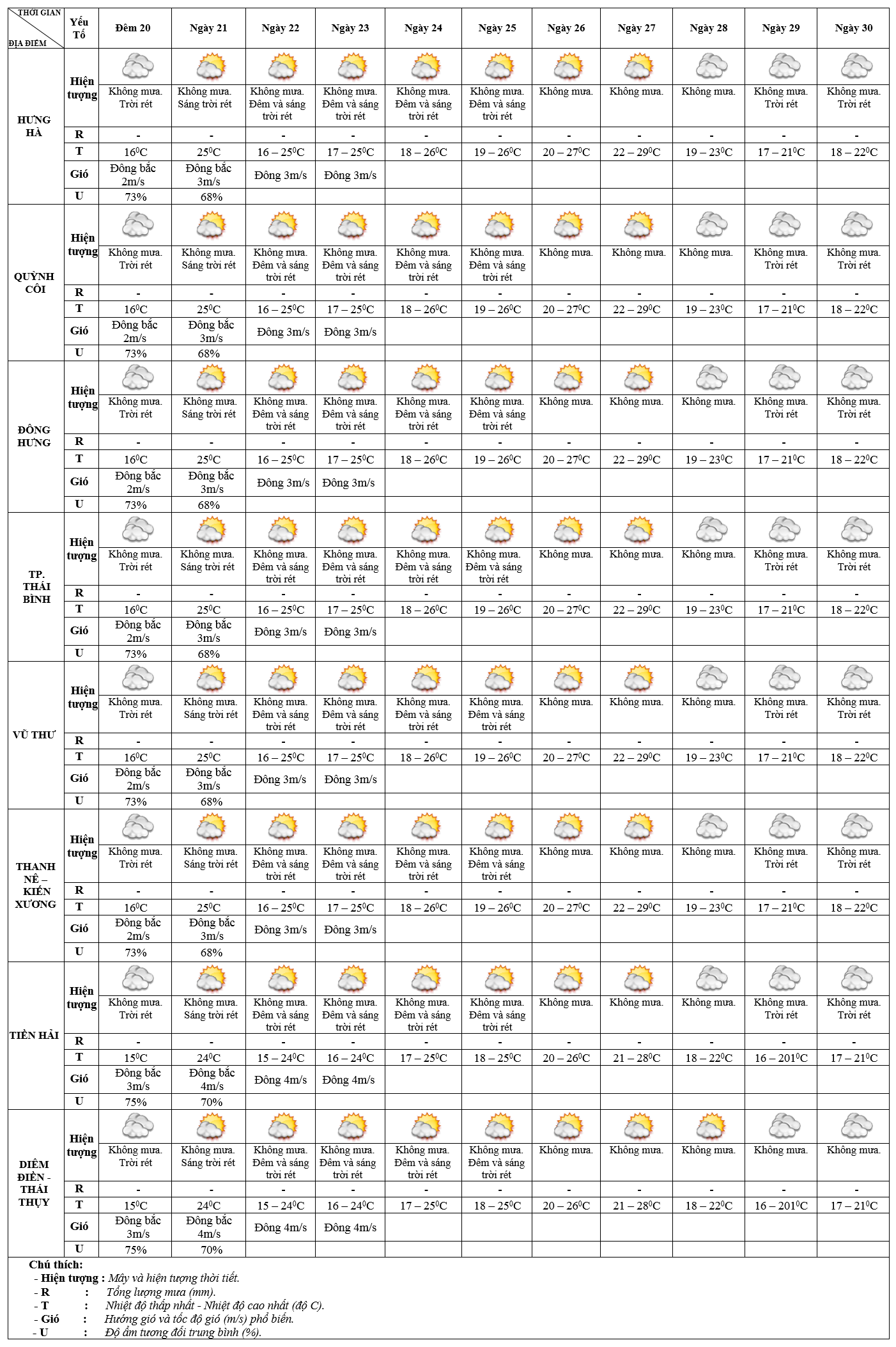 DỰ BÁO THỜI TIẾT ĐIỂM 10 NGÀY KHU VỰC THÁI BÌNH TỪ ĐÊM 20 – 30/3/2025