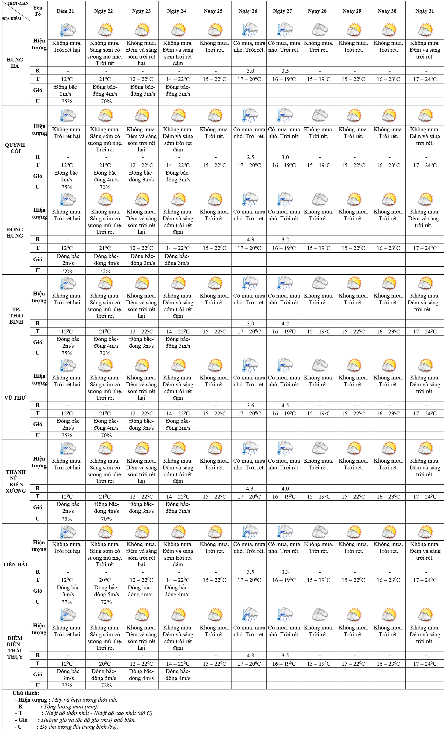 DỰ BÁO THỜI TIẾT ĐIỂM 10 NGÀY KHU VỰC THÁI BÌNH TỪ ĐÊM 21 – 31/12/2024