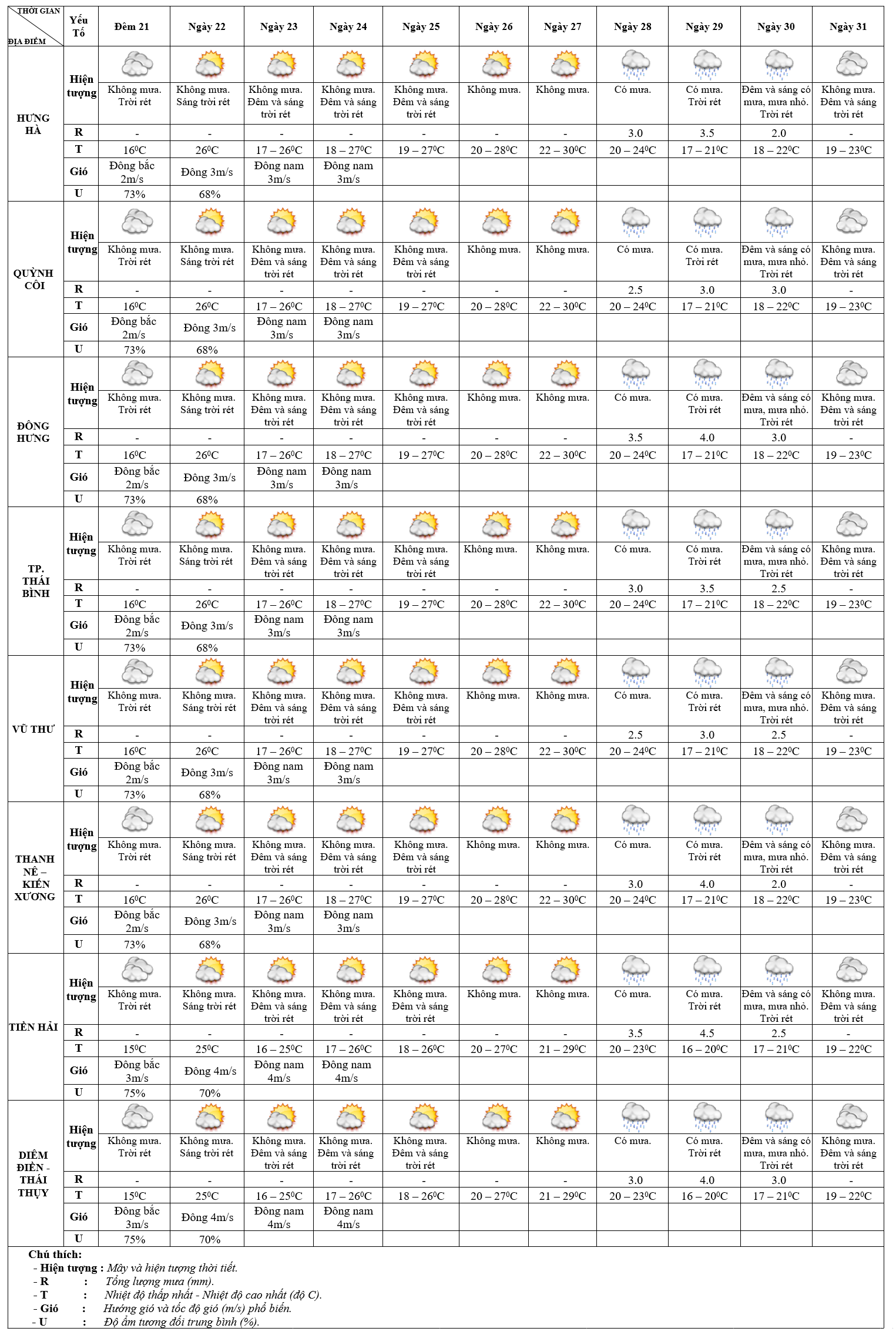 DỰ BÁO THỜI TIẾT ĐIỂM 10 NGÀY KHU VỰC THÁI BÌNH TỪ ĐÊM 21 – 31/3/2025