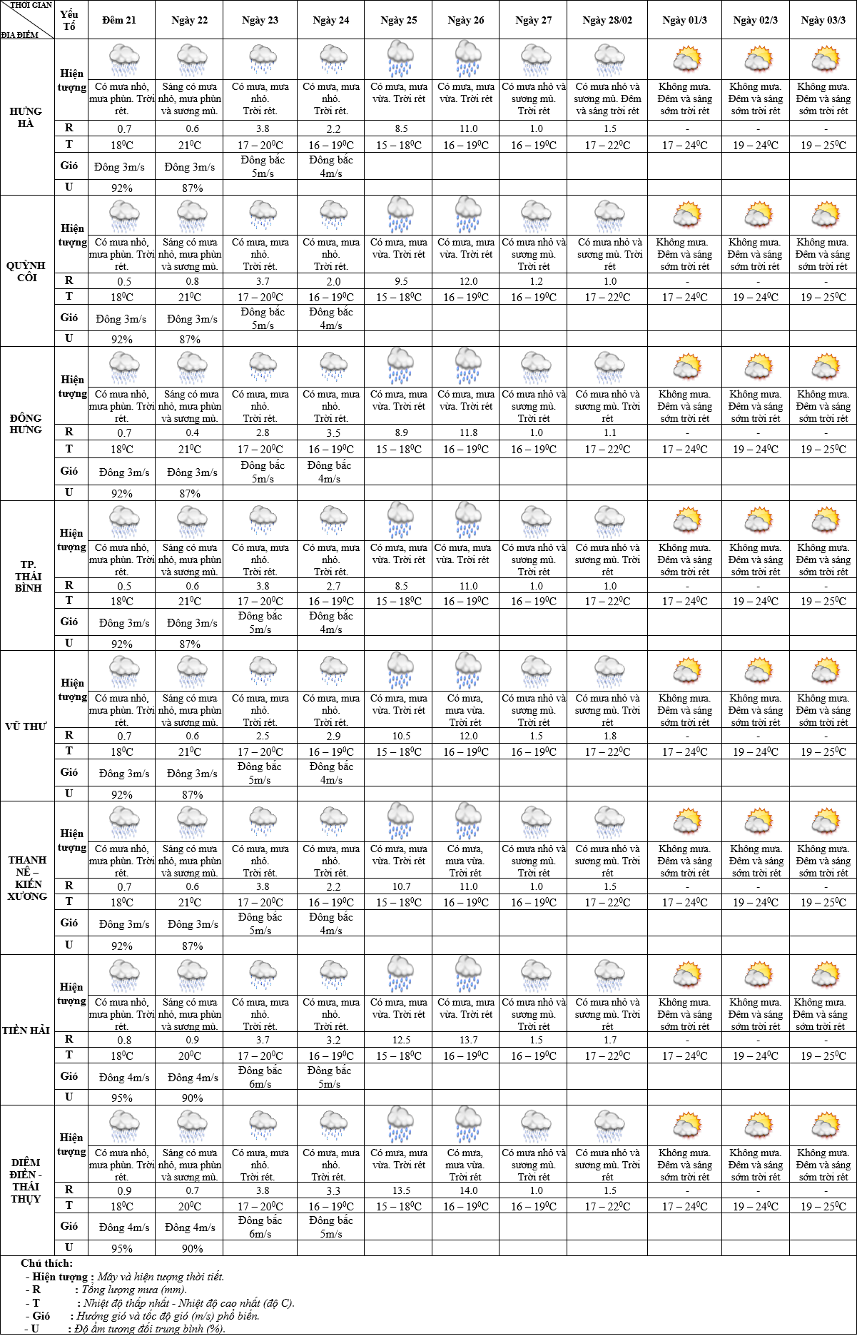 DỰ BÁO THỜI TIẾT ĐIỂM 10 NGÀY KHU VỰC THÁI BÌNH TỪ ĐÊM 21/02 – 03/3/2025