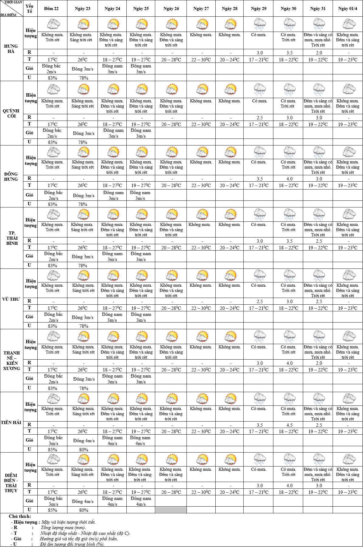 DỰ BÁO THỜI TIẾT ĐIỂM 10 NGÀY KHU VỰC THÁI BÌNH TỪ ĐÊM 22/3 – 01/4/2025