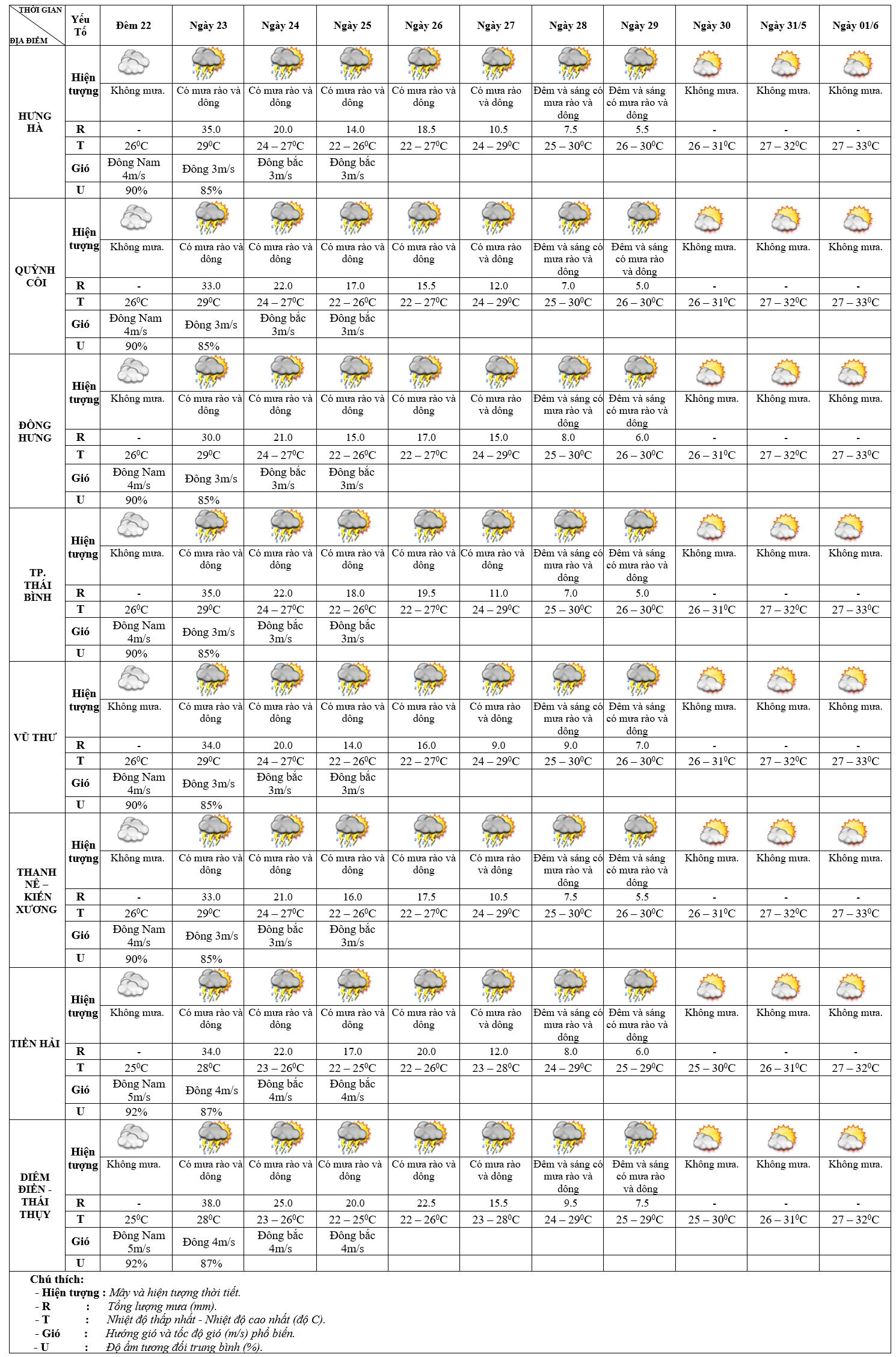 DỰ BÁO THỜI TIẾT ĐIỂM 10 NGÀY KHU VỰC THÁI BÌNH TỪ ĐÊM 22/5 – 01/6/2025