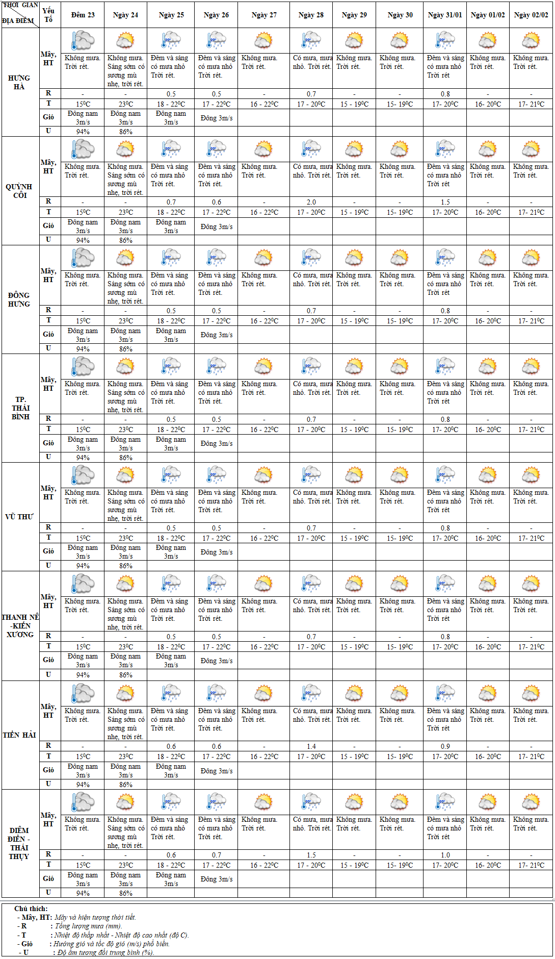 DỰ BÁO THỜI TIẾT ĐIỂM 10 NGÀY KHU VỰC THÁI BÌNH TỪ ĐÊM 23/01 – 02/02/2021