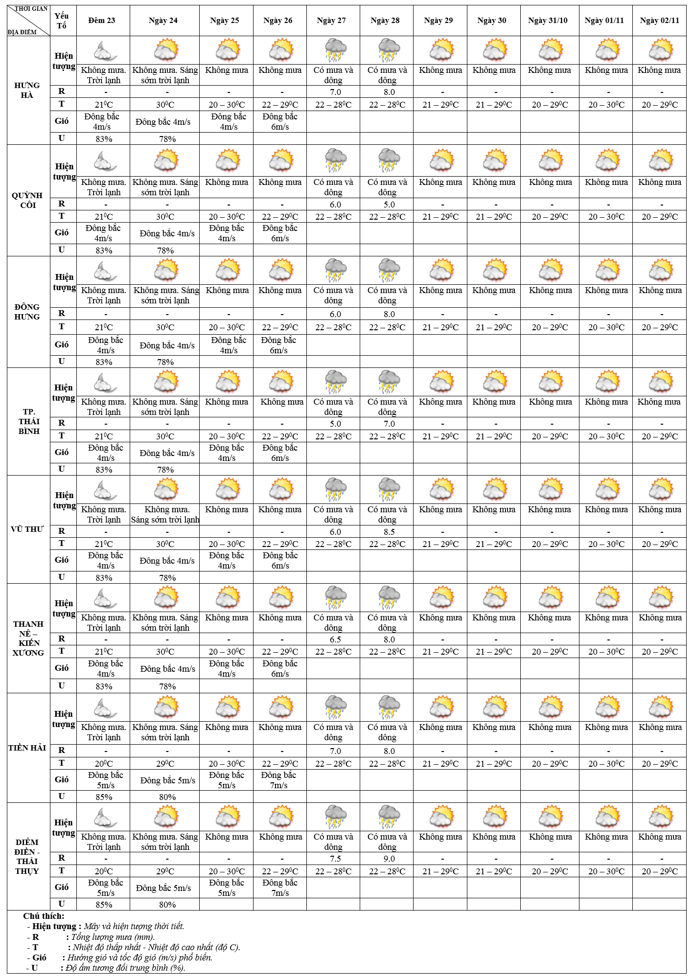 DỰ BÁO THỜI TIẾT ĐIỂM 10 NGÀY KHU VỰC THÁI BÌNH TỪ ĐÊM 23/10 – 02/11/2024