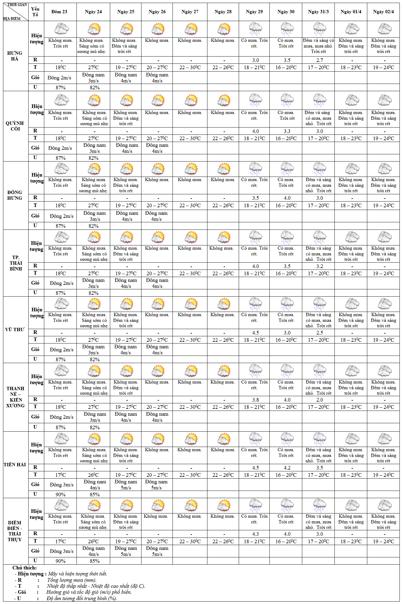 DỰ BÁO THỜI TIẾT ĐIỂM 10 NGÀY KHU VỰC THÁI BÌNH TỪ ĐÊM 23/3 – 02/4/2025