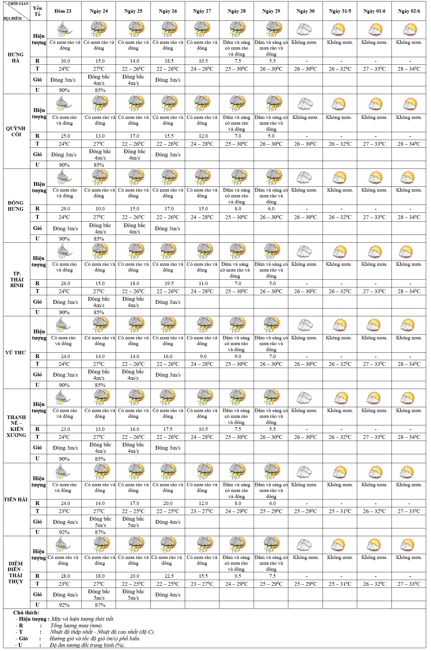 DỰ BÁO THỜI TIẾT ĐIỂM 10 NGÀY KHU VỰC THÁI BÌNH TỪ ĐÊM 23/5 – 02/6/2025