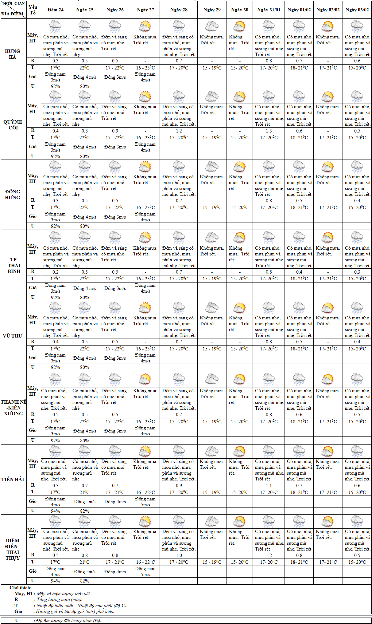 DỰ BÁO THỜI TIẾT ĐIỂM 10 NGÀY KHU VỰC THÁI BÌNH TỪ ĐÊM 24/01 – 03/02/2021