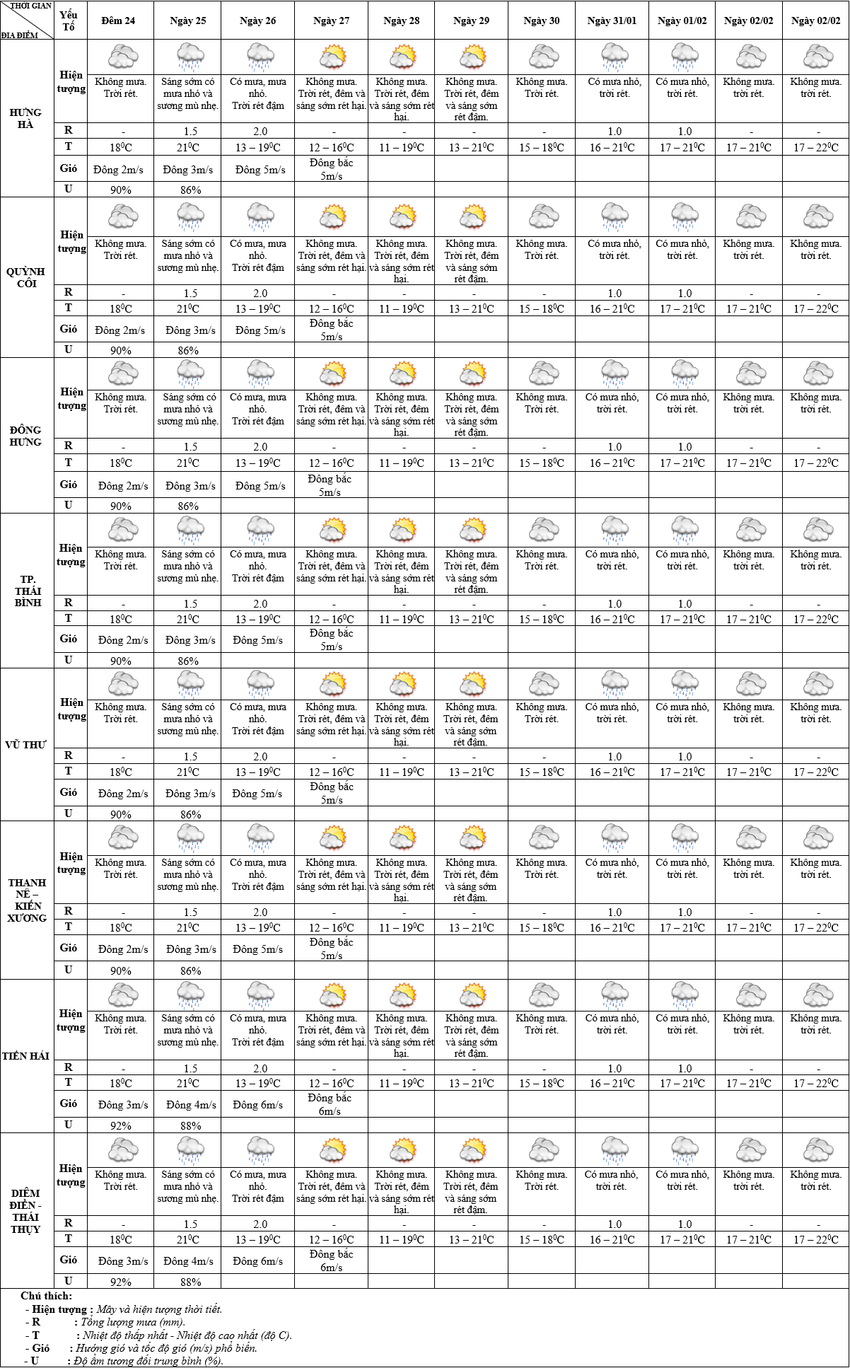 DỰ BÁO THỜI TIẾT ĐIỂM 10 NGÀY KHU VỰC THÁI BÌNH TỪ ĐÊM 24/01 – 03/02/2025