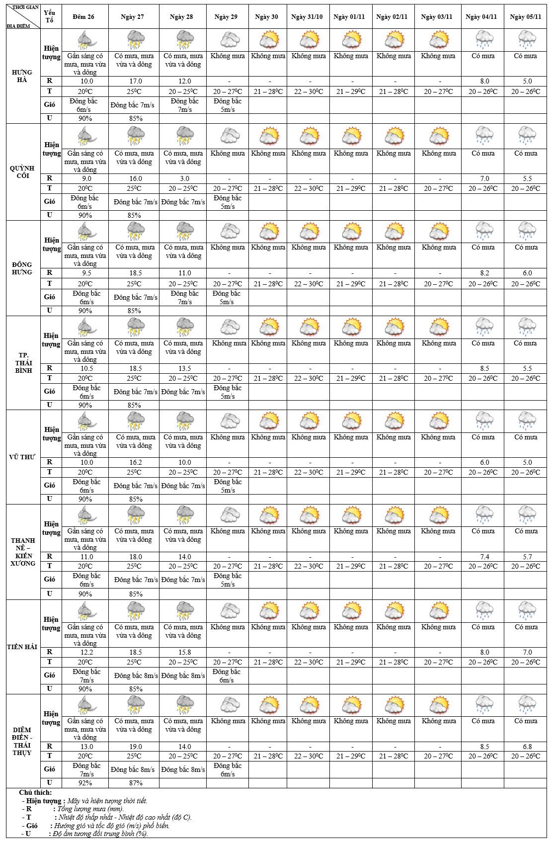 DỰ BÁO THỜI TIẾT ĐIỂM 10 NGÀY KHU VỰC THÁI BÌNH TỪ ĐÊM 26/10 – 05/11/2024