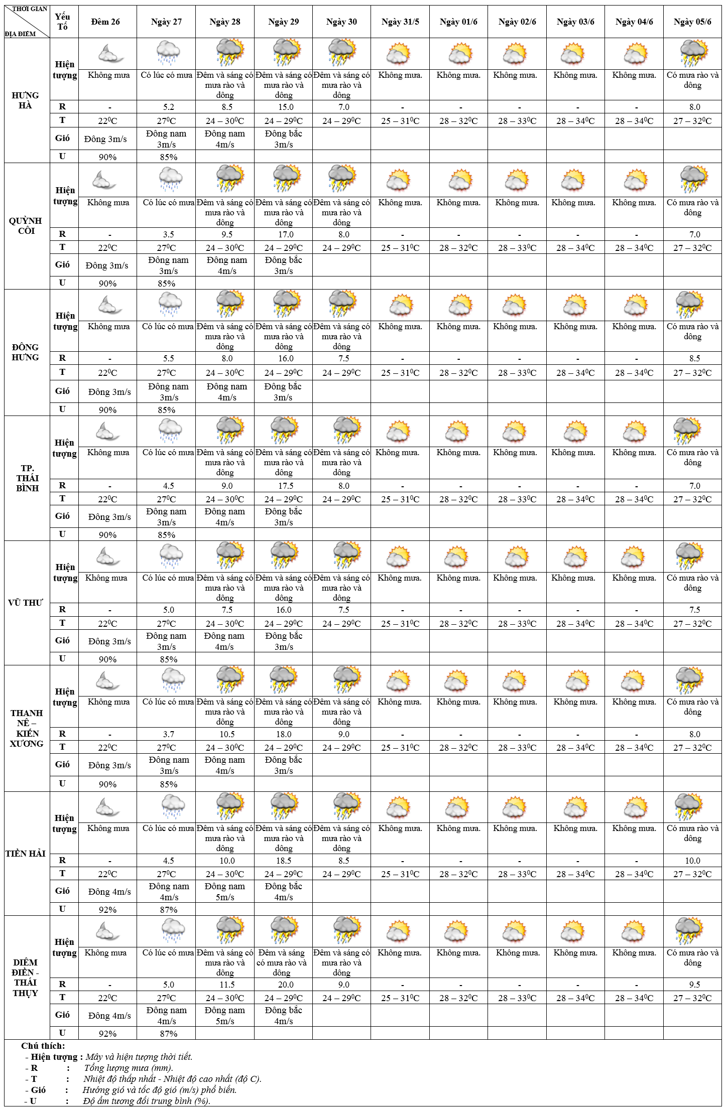 DỰ BÁO THỜI TIẾT ĐIỂM 10 NGÀY KHU VỰC THÁI BÌNH TỪ ĐÊM 26/5 – 05/6/2025