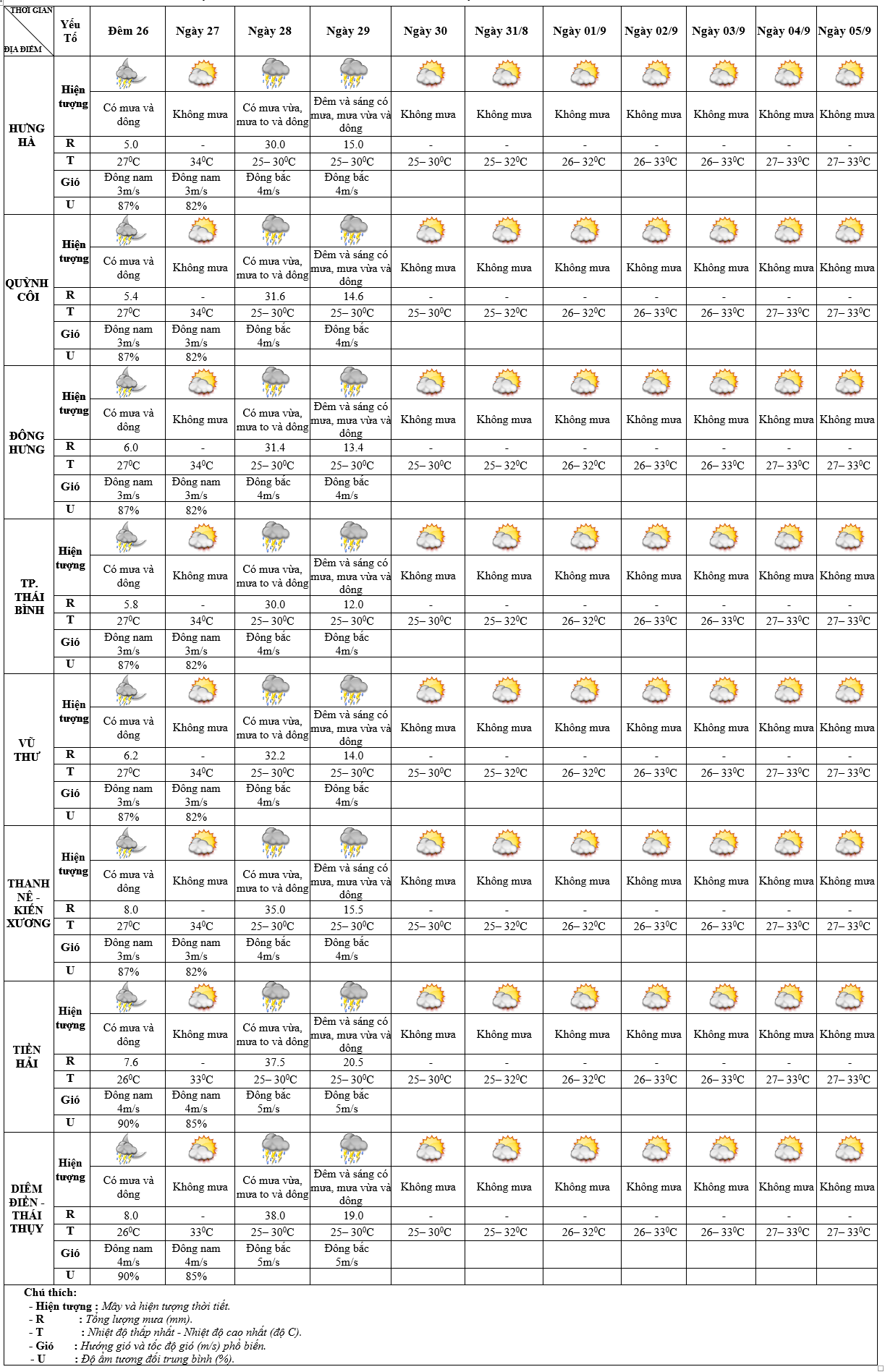DỰ BÁO THỜI TIẾT ĐIỂM 10 NGÀY KHU VỰC THÁI BÌNH TỪ ĐÊM 26/8 – 05/9/2023