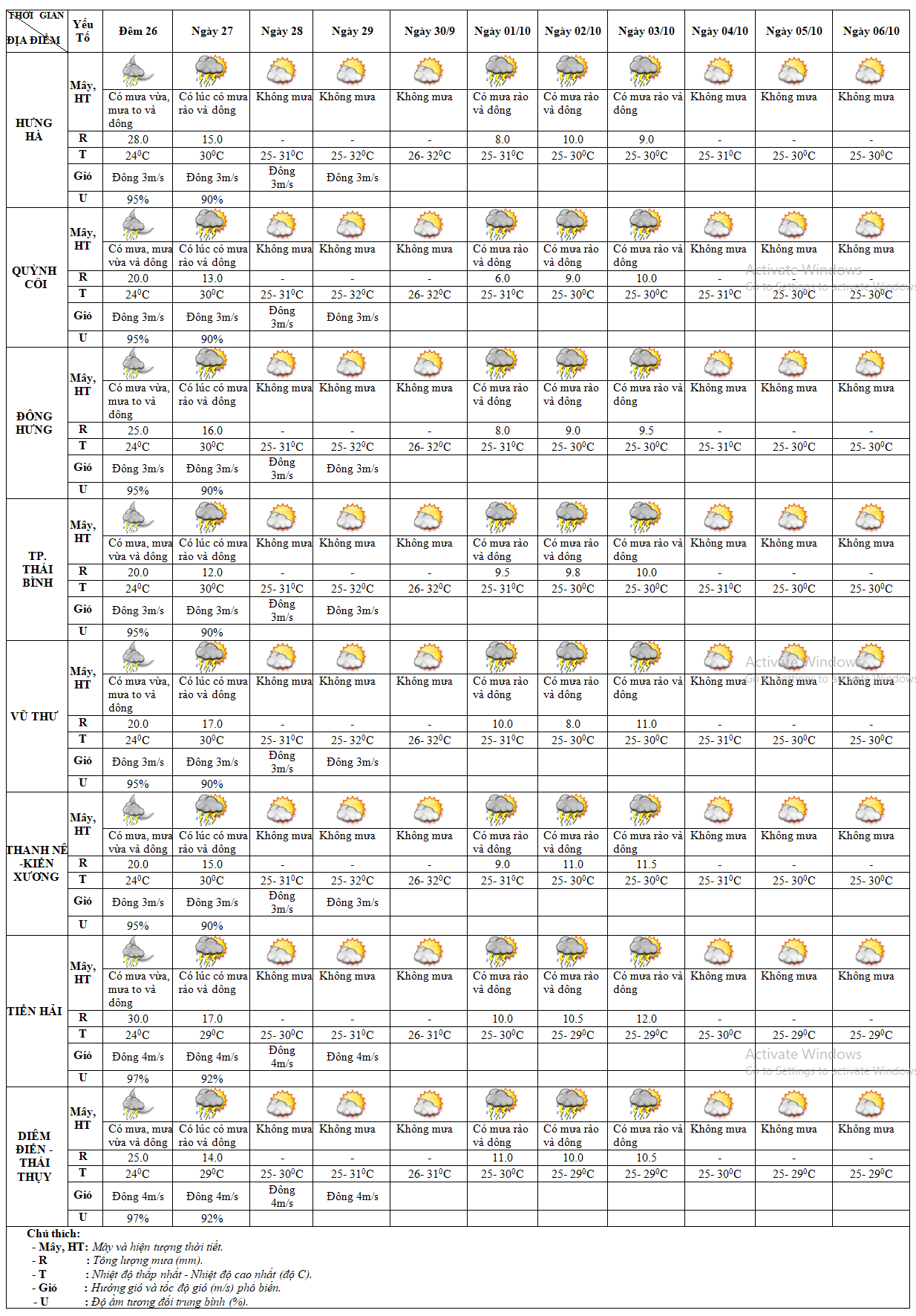 DỰ BÁO THỜI TIẾT ĐIỂM 10 NGÀY KHU VỰC THÁI BÌNH TỪ ĐÊM 26/9 – 06/10/2021
