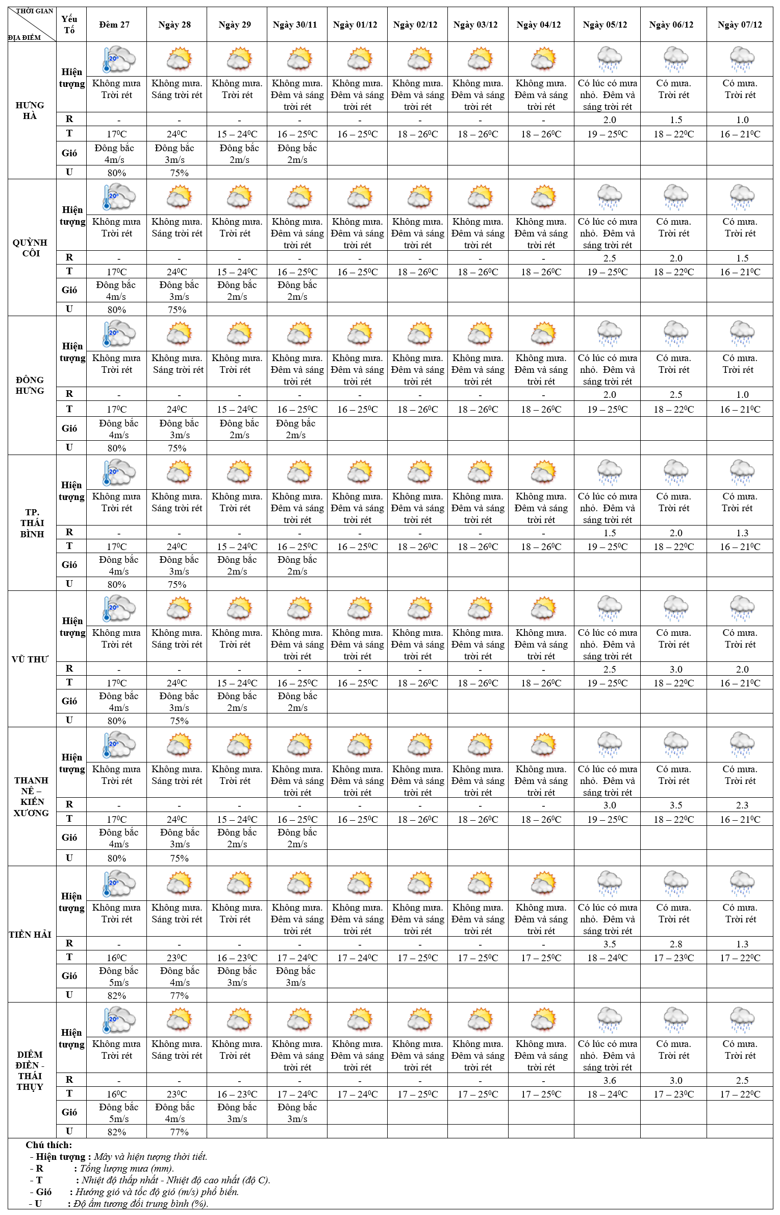 DỰ BÁO THỜI TIẾT ĐIỂM 10 NGÀY KHU VỰC THÁI BÌNH TỪ ĐÊM 27/11 – 07/12/2024