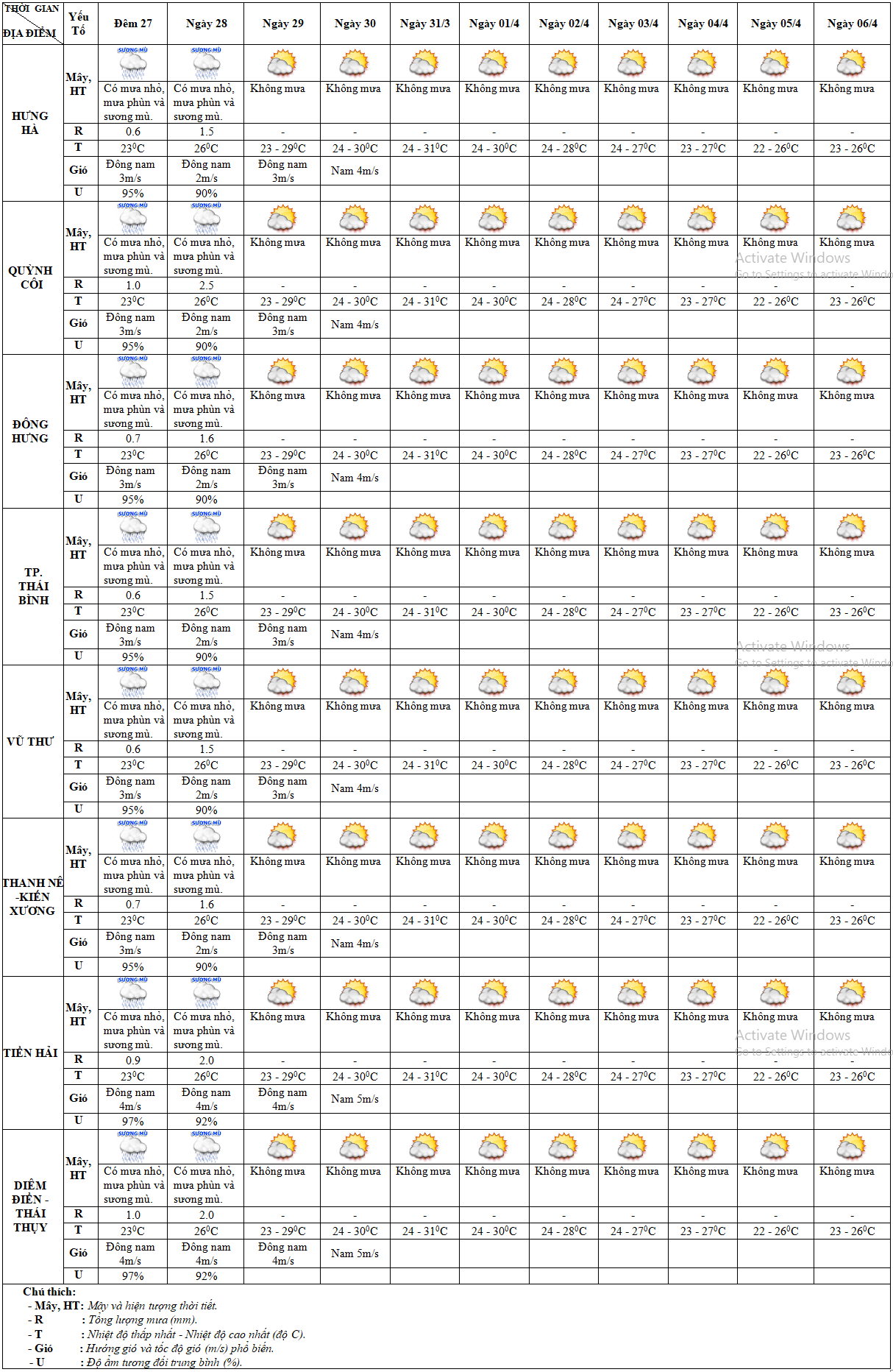DỰ BÁO THỜI TIẾT ĐIỂM 10 NGÀY KHU VỰC THÁI BÌNH TỪ ĐÊM 27/3 – 06/4/2021