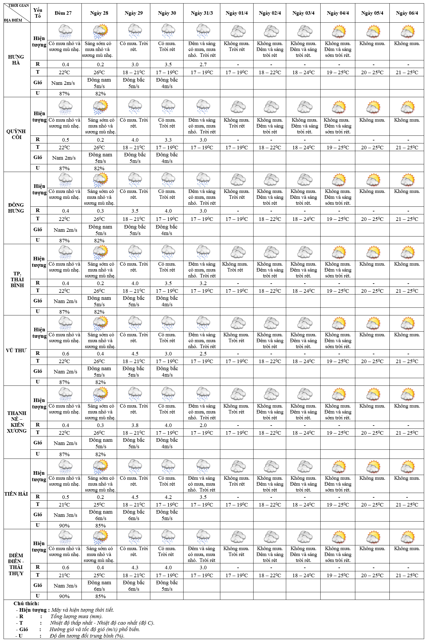 DỰ BÁO THỜI TIẾT ĐIỂM 10 NGÀY KHU VỰC THÁI BÌNH TỪ ĐÊM 27/3 – 06/4/2025