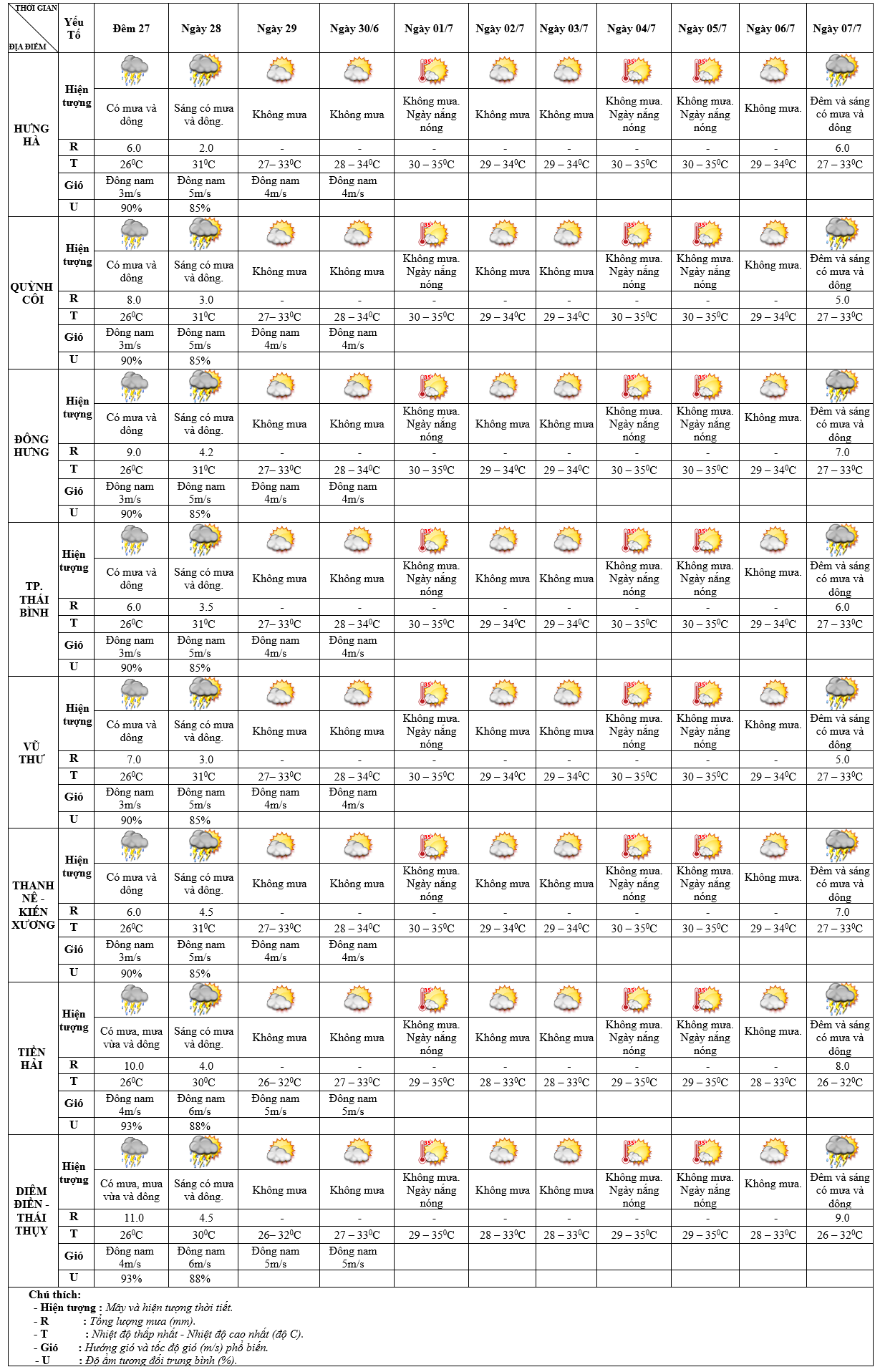 DỰ BÁO THỜI TIẾT ĐIỂM 10 NGÀY KHU VỰC THÁI BÌNH TỪ ĐÊM 27/6 – 07/7/2023
