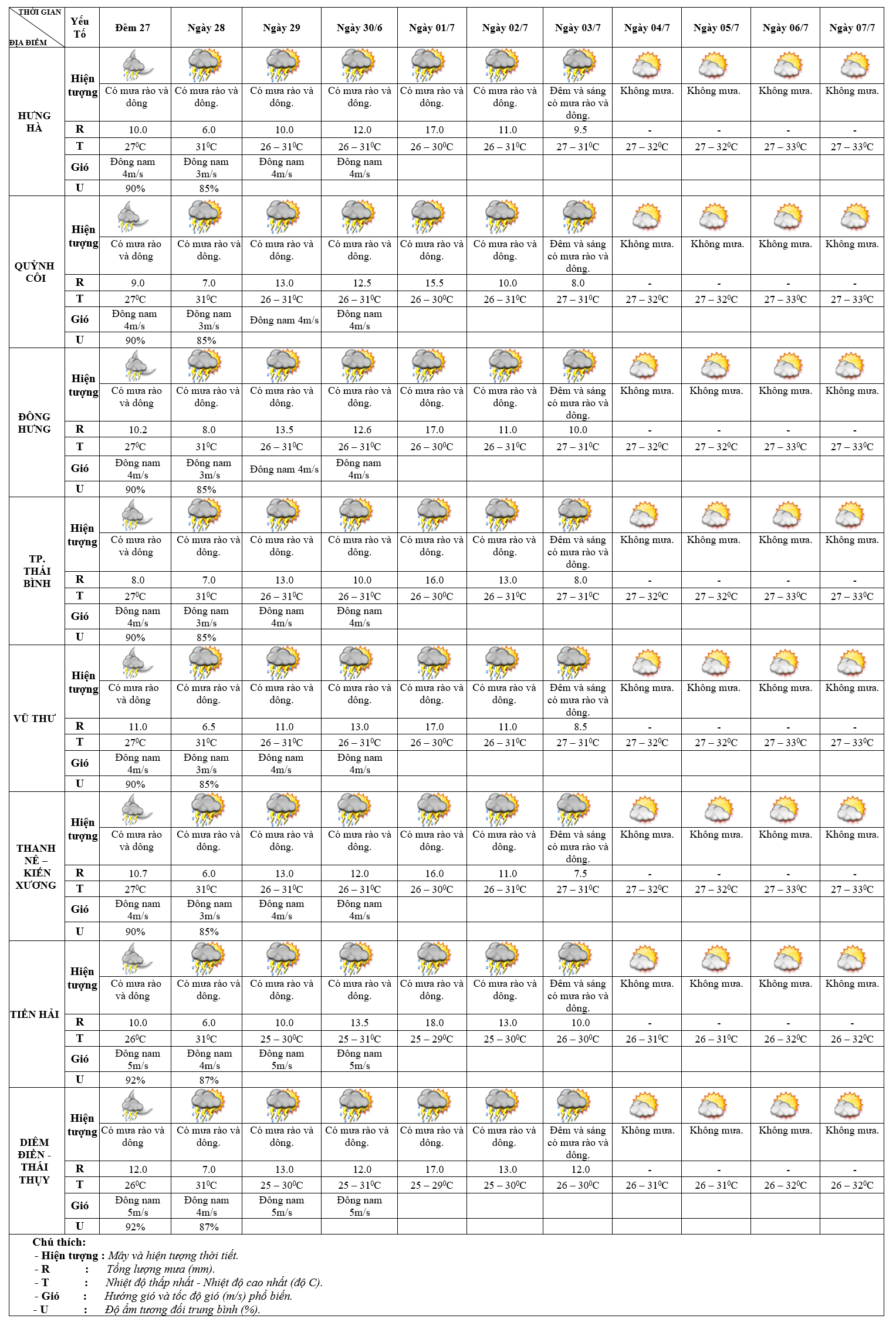 DỰ BÁO THỜI TIẾT ĐIỂM 10 NGÀY KHU VỰC THÁI BÌNH TỪ ĐÊM 27/6 – 07/7/2025