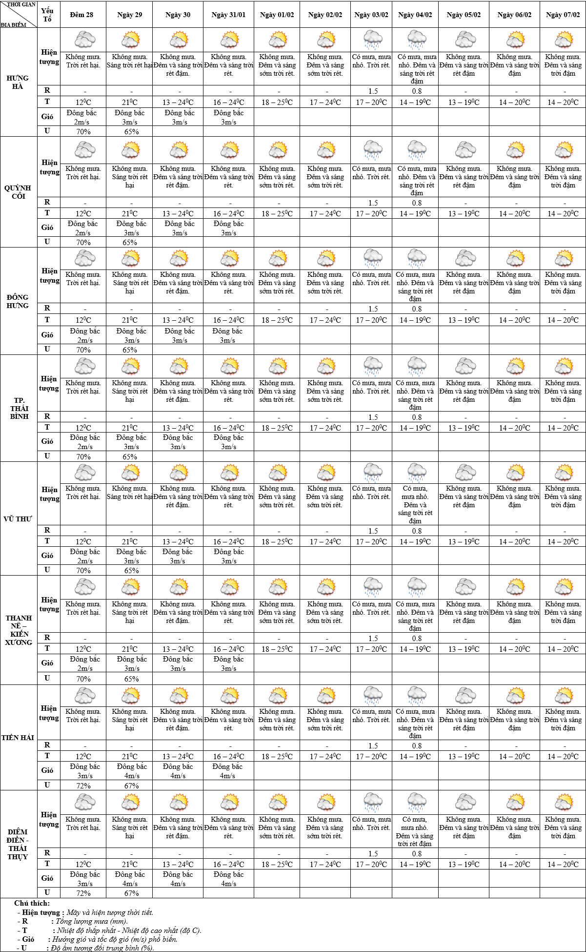 DỰ BÁO THỜI TIẾT ĐIỂM 10 NGÀY KHU VỰC THÁI BÌNH TỪ ĐÊM 28/01 – 07/02/2025