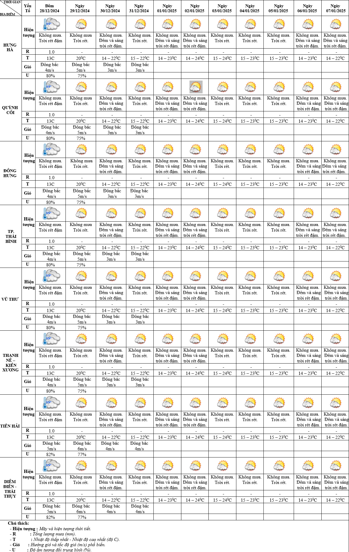 DỰ BÁO THỜI TIẾT ĐIỂM 10 NGÀY KHU VỰC THÁI BÌNH TỪ ĐÊM 28/12/2024 – 07/01/2025