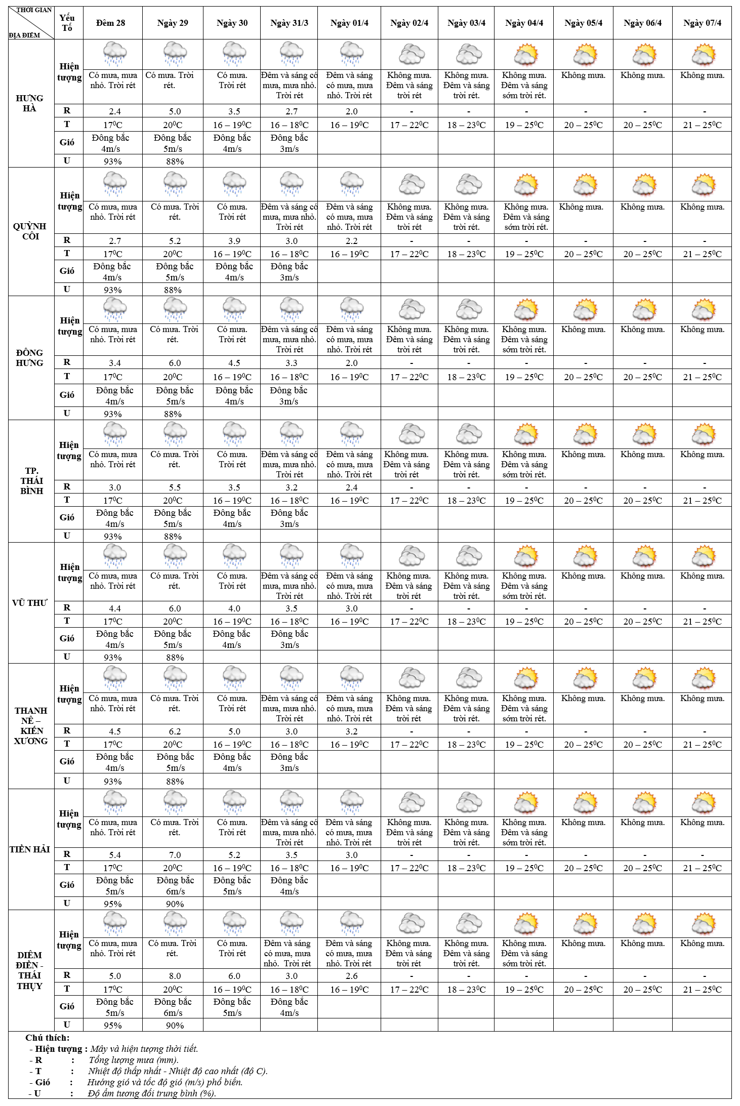 DỰ BÁO THỜI TIẾT ĐIỂM 10 NGÀY KHU VỰC THÁI BÌNH TỪ ĐÊM 28/3 – 07/4/2025