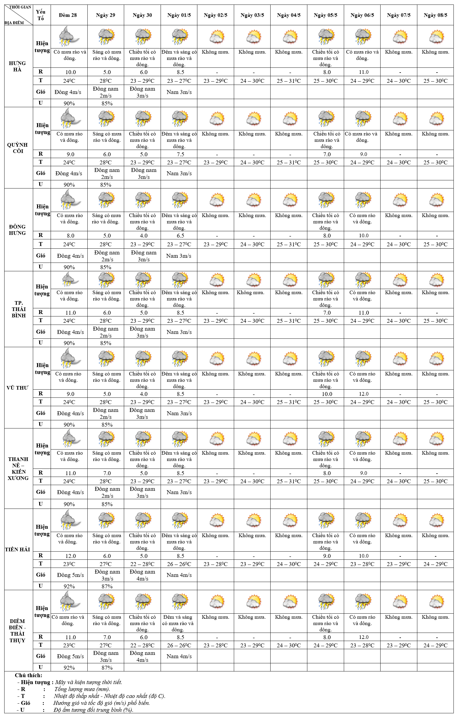 DỰ BÁO THỜI TIẾT ĐIỂM 10 NGÀY KHU VỰC THÁI BÌNH TỪ ĐÊM 28/4 – 08/5/2025