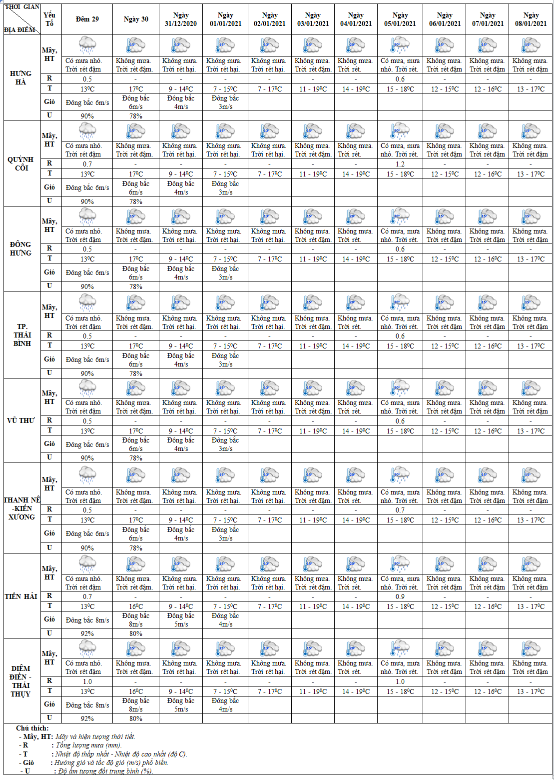 DỰ BÁO THỜI TIẾT ĐIỂM 10 NGÀY KHU VỰC THÁI BÌNH TỪ ĐÊM 29/12/2020 – 08/01/2021