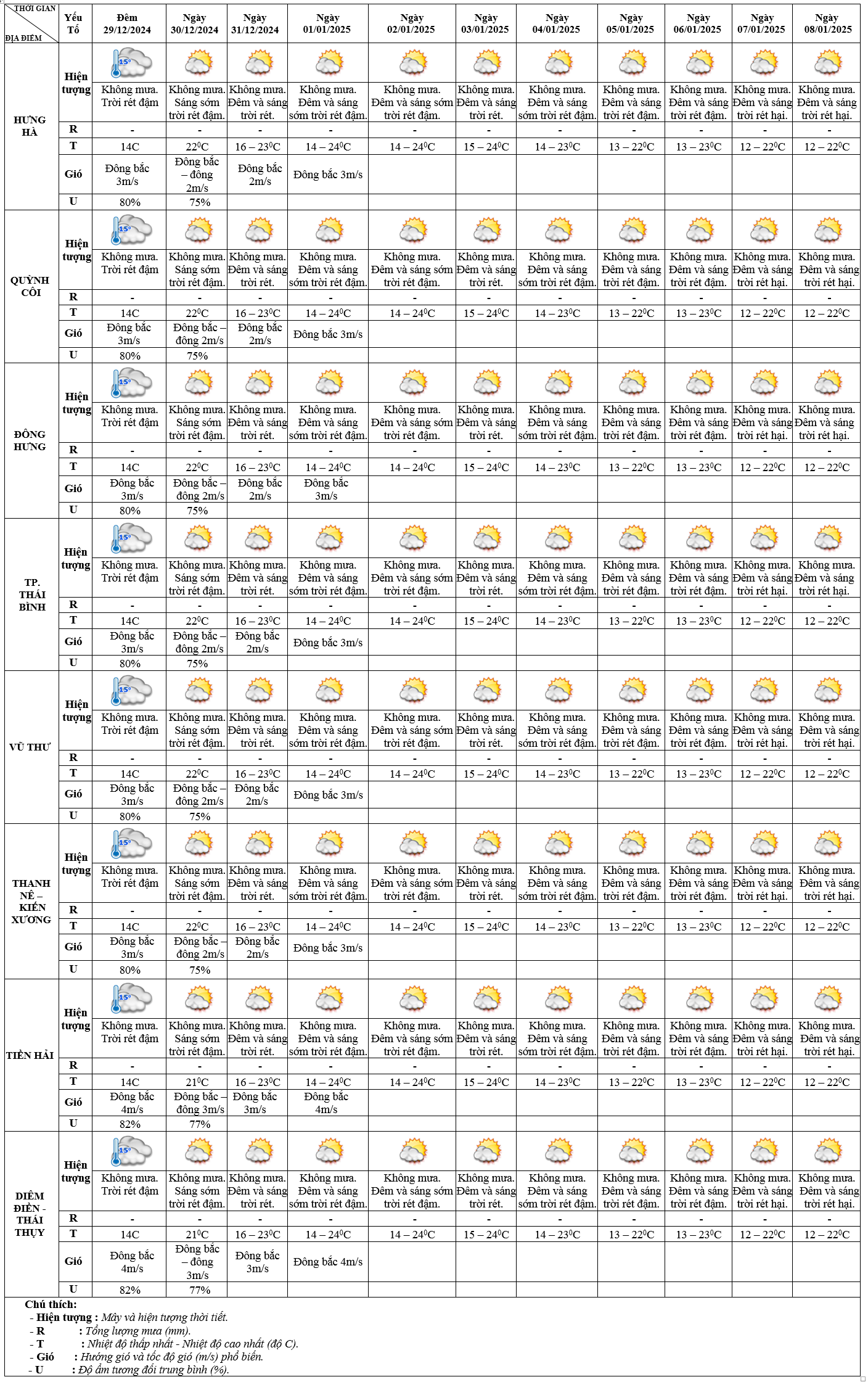 DỰ BÁO THỜI TIẾT ĐIỂM 10 NGÀY KHU VỰC THÁI BÌNH TỪ ĐÊM 29/12/2024 – 08/01/2025