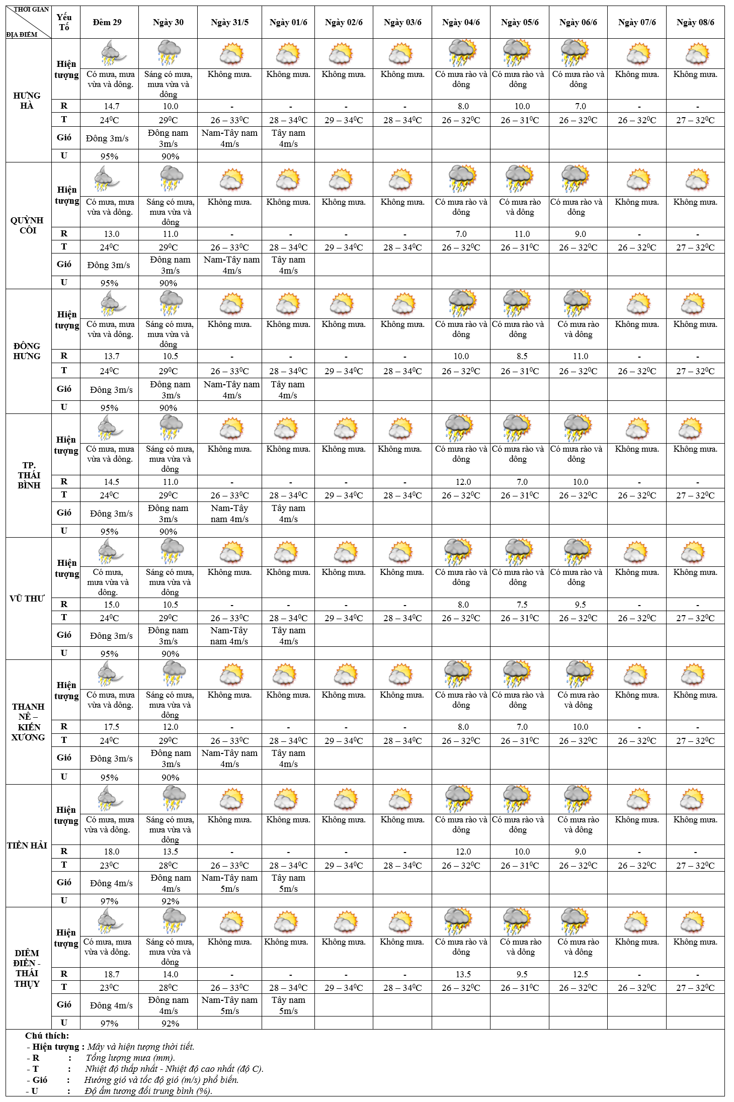 DỰ BÁO THỜI TIẾT ĐIỂM 10 NGÀY KHU VỰC THÁI BÌNH TỪ ĐÊM 29/5 – 08/6/2025