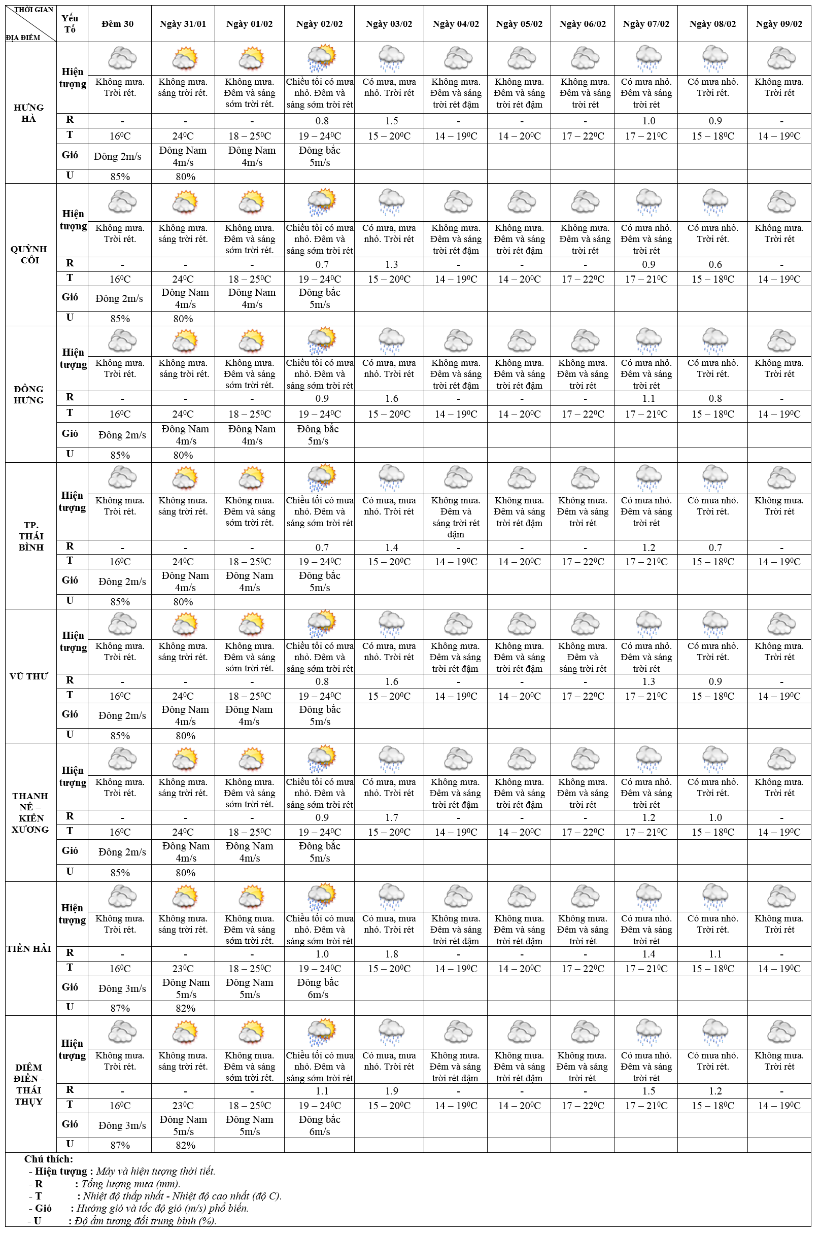 DỰ BÁO THỜI TIẾT ĐIỂM 10 NGÀY KHU VỰC THÁI BÌNH TỪ ĐÊM 30/01 – 09/02/2025