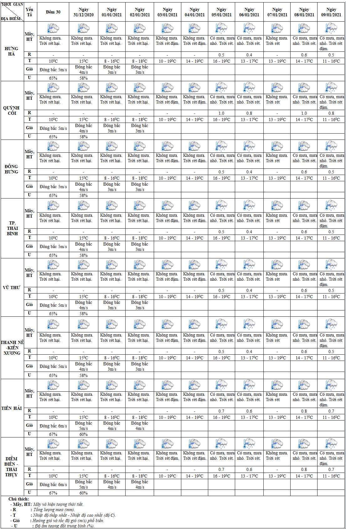 DỰ BÁO THỜI TIẾT ĐIỂM 10 NGÀY KHU VỰC THÁI BÌNH TỪ ĐÊM 30/12/2020 – 09/01/2021