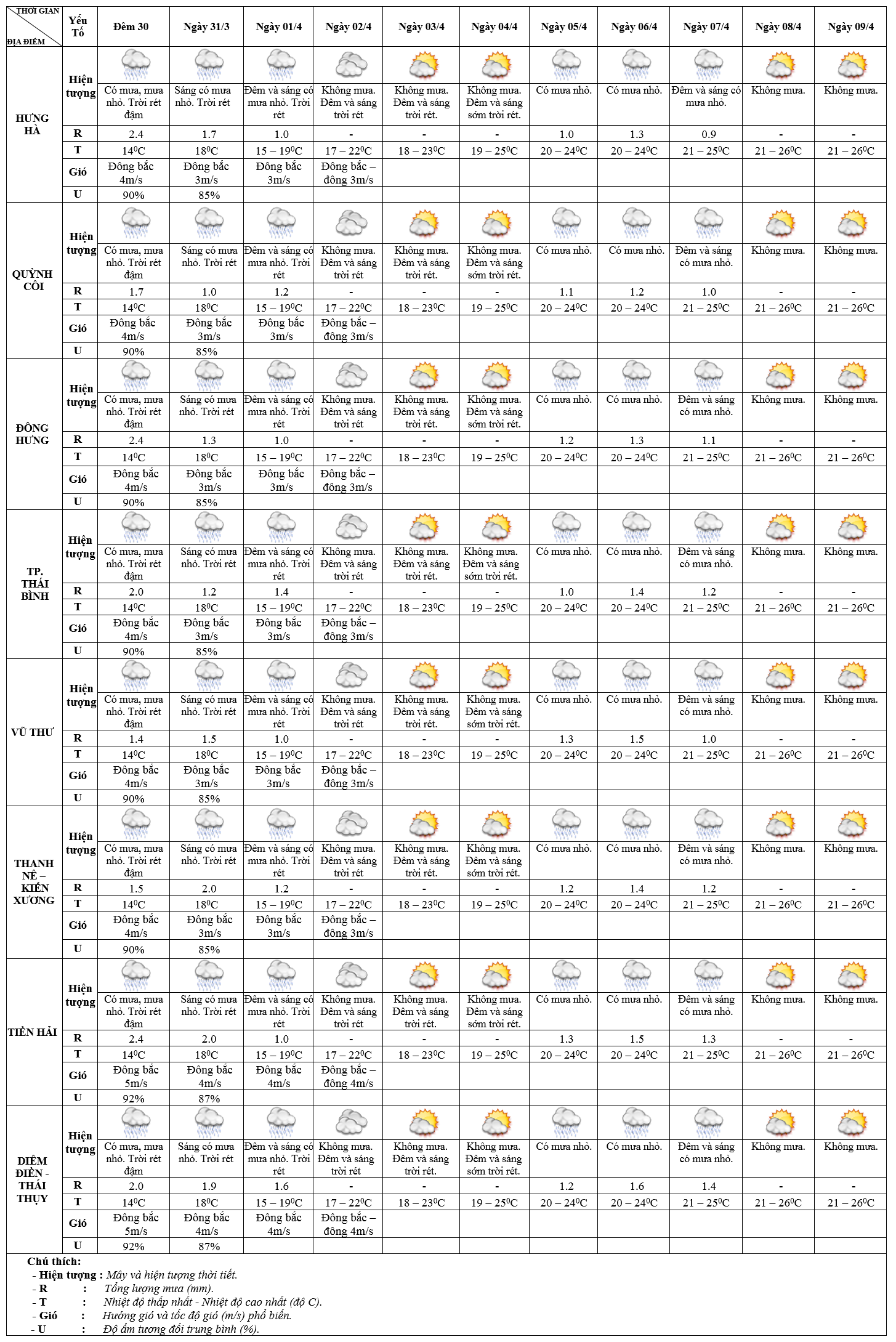 DỰ BÁO THỜI TIẾT ĐIỂM 10 NGÀY KHU VỰC THÁI BÌNH TỪ ĐÊM 30/3 – 09/4/2025