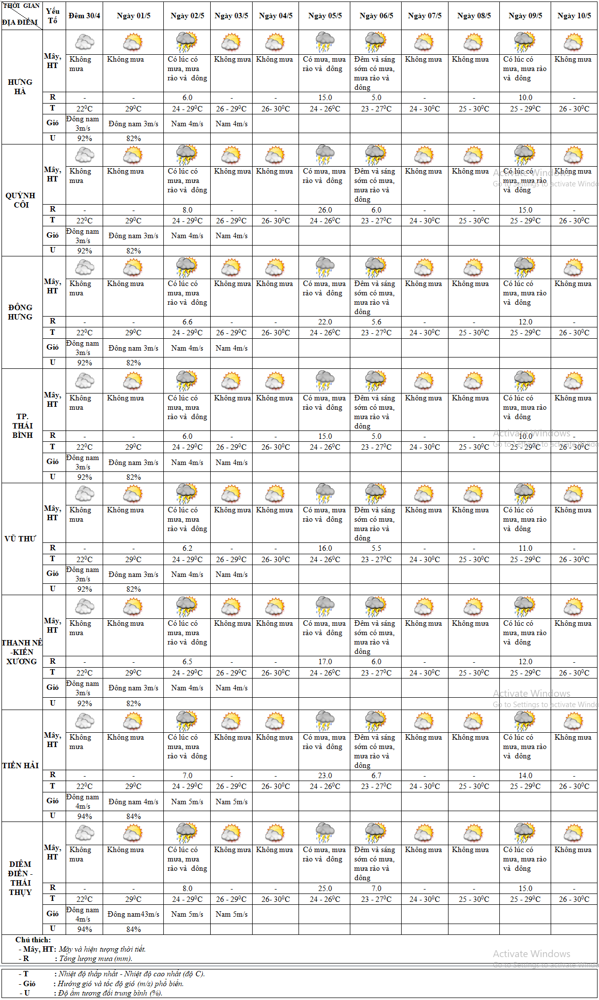 DỰ BÁO THỜI TIẾT ĐIỂM 10 NGÀY KHU VỰC THÁI BÌNH TỪ ĐÊM 30/4 – 10/5/2021